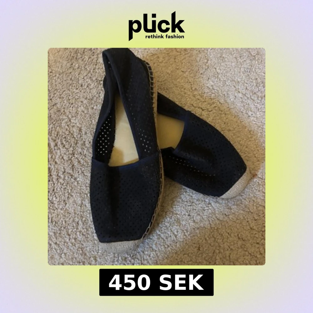 Säljer ett par mörkblå espadrillos med perforerat mönster och ljus sula i repstil. Skorna har rund tå och platt sula, perfekta för varmare dagar. Lätta att ta på och av, passar till många olika outfits.