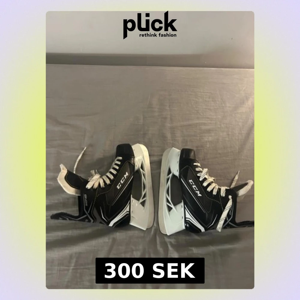 Säljer ett par svarta CCM Tacks skridskor med vita detaljer och snörning. Skridskorna har en sportig design med robust plastsula och metallblad. Perfekt för dig som vill ha snygga och bekväma skridskor på isen. Märke och storlek syns tydligt på plösen. Ps frakt ingår ej