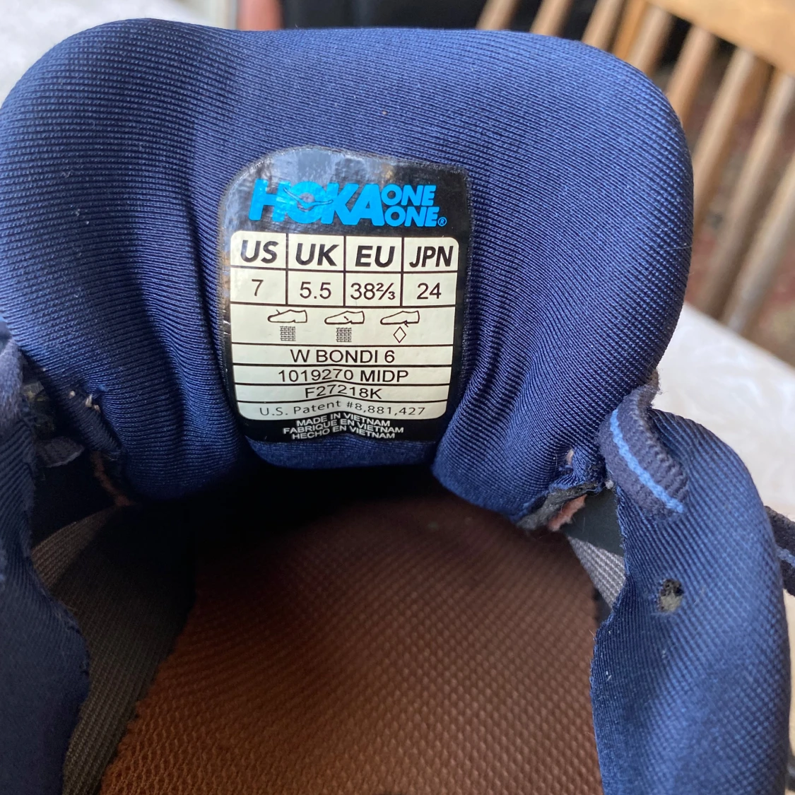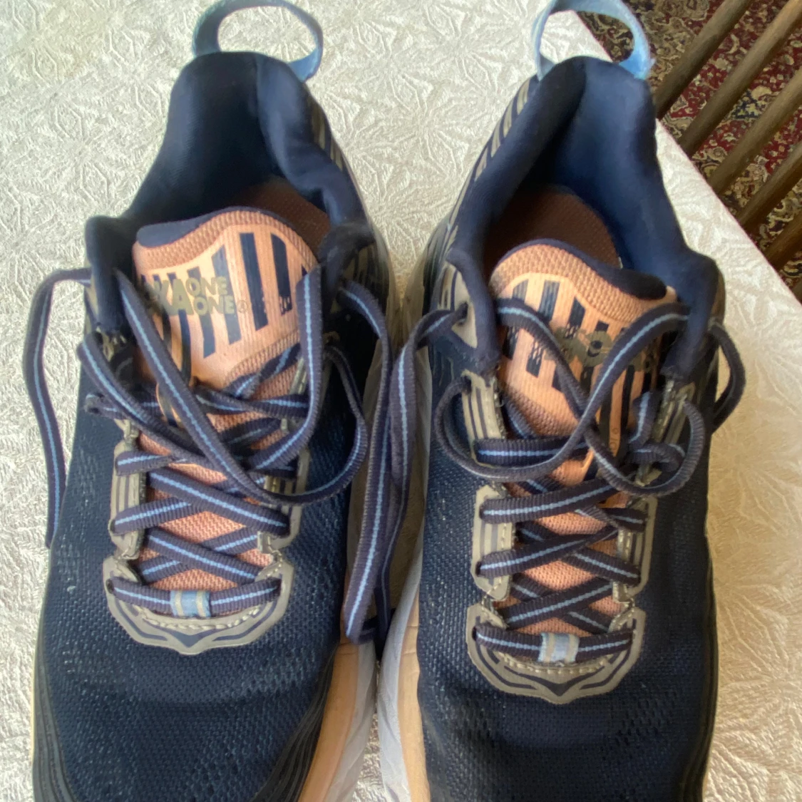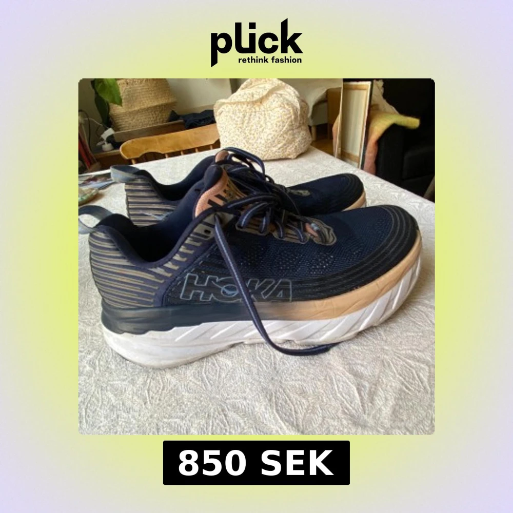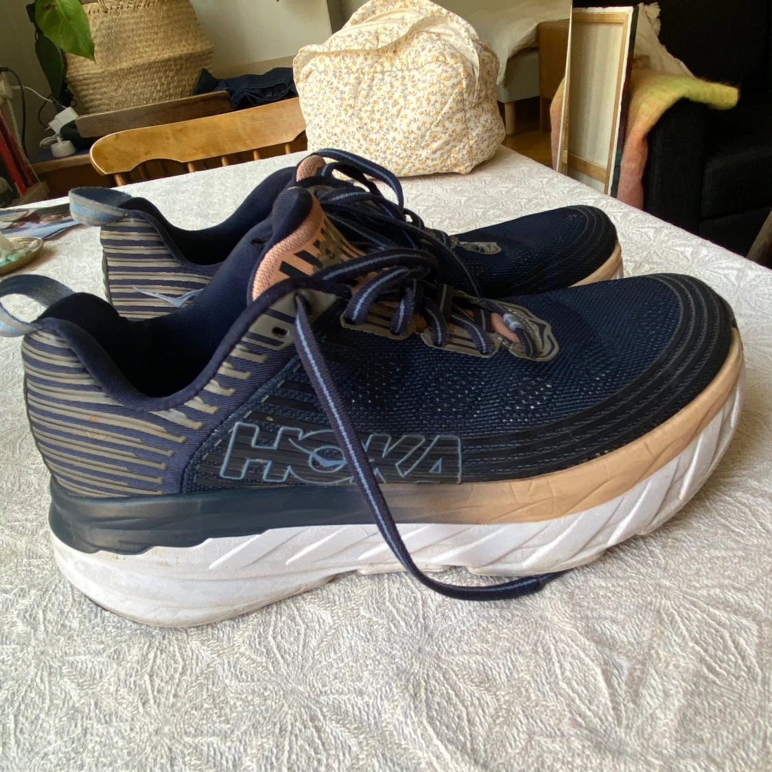 Snygga Hoka One One Bondi 6 sneakers i marinblått med beige och vita detaljer. Skorna har en chunky sula, mesh-ovandel och klassisk snörning. Perfekta för dig som gillar komfort och sportig stil.
