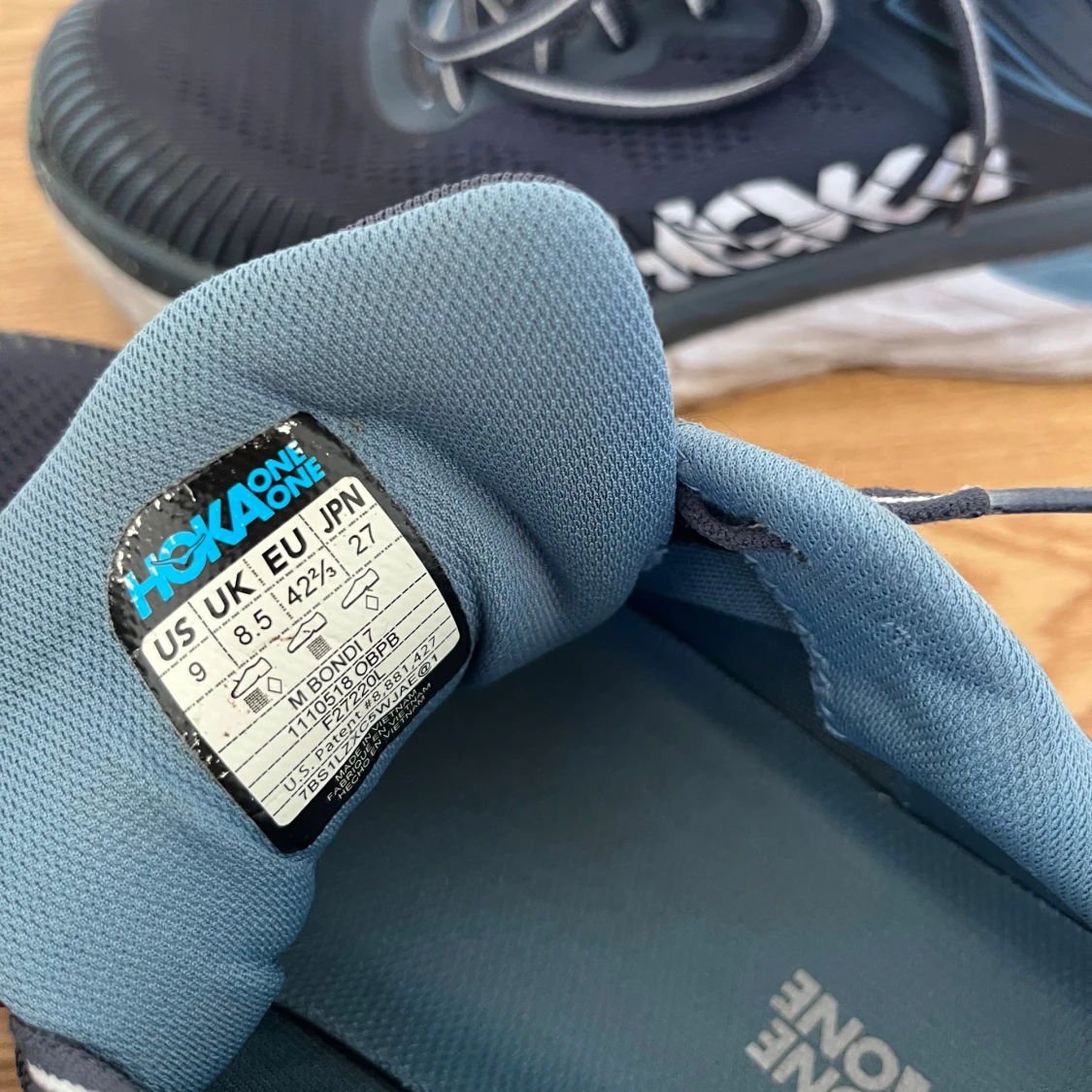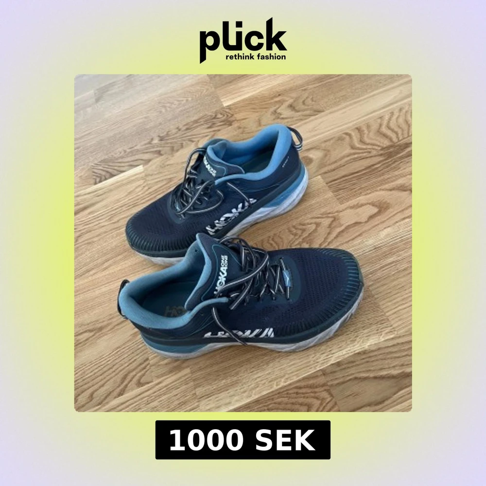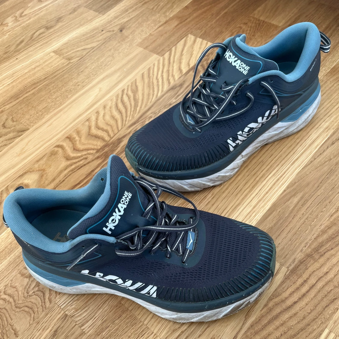 Säljer ett par Hoka One One Bondi 7 sneakers i mörkblått med ljusblå detaljer och vit sula. Skorna har snörning, mesh-ovandel och extra tjock, dämpad sula för maxad komfort. Perfekta för dig som gillar att springa eller promenera långt/ jobbskor