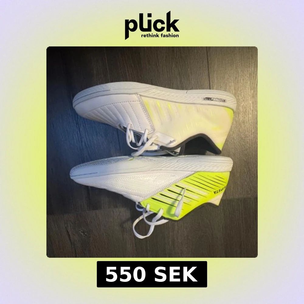 Säljer ett par kipsta Ginka Pro Futsal skor i storlek 42. Skorna är vita med neon-gula detaljer och har snörning. De har en låg profil och platt sula, perfekt för futsal. Ovandelen är tillverkad i syntetmaterial med quiltade paneler och svart kant runt öppningen.