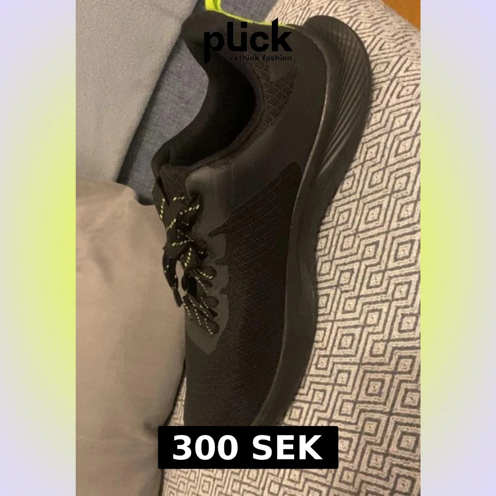 Svarta sneakers från Crivit i storlek 46 med neongula detaljer på hälen och snören med gul mönstring. Ovandelen är i mesh och syntet, vilket ger en sportig vibe och bra ventilation. Platt sula och rund tå för skön komfort. Perfekt för dig som gillar stilrena träningsskor.