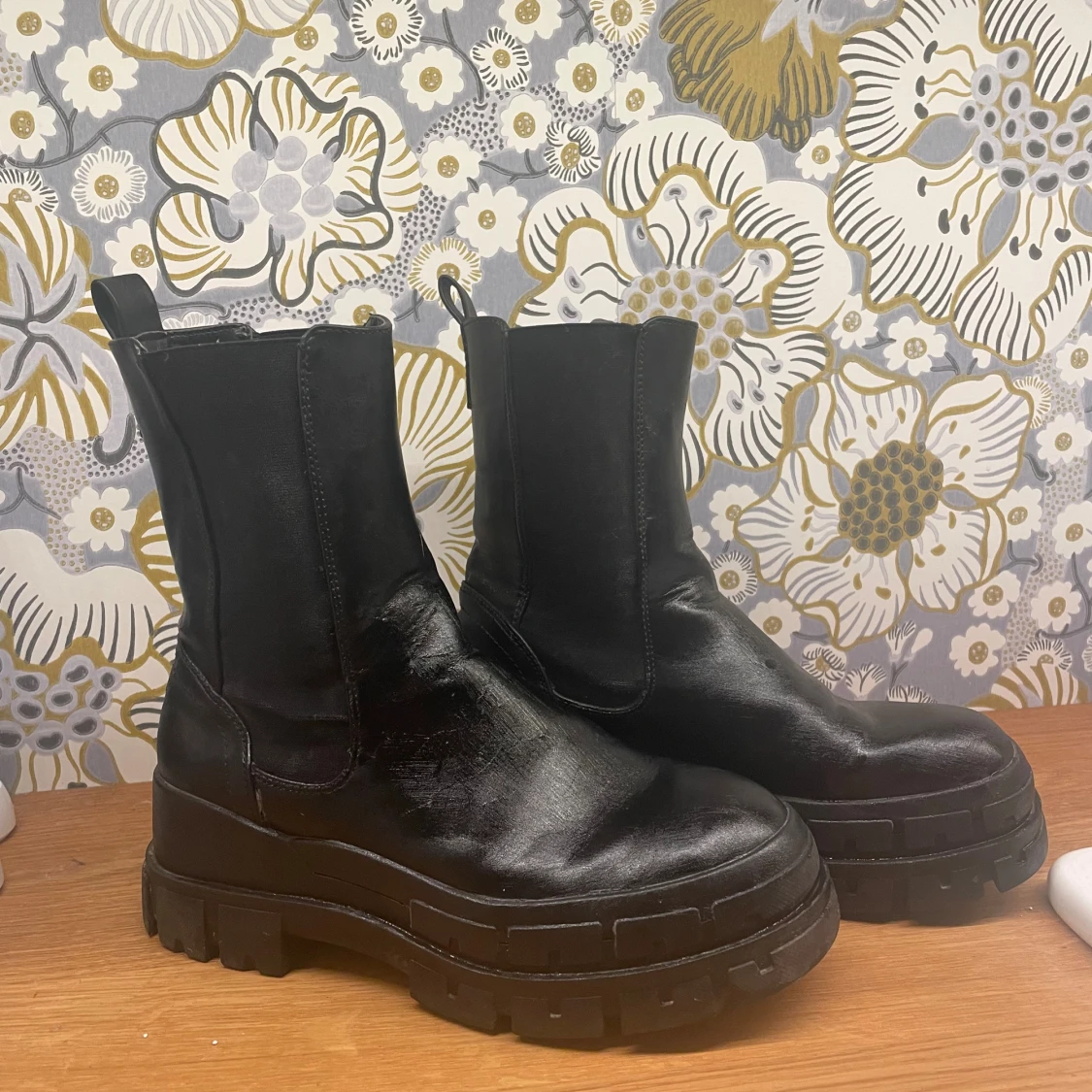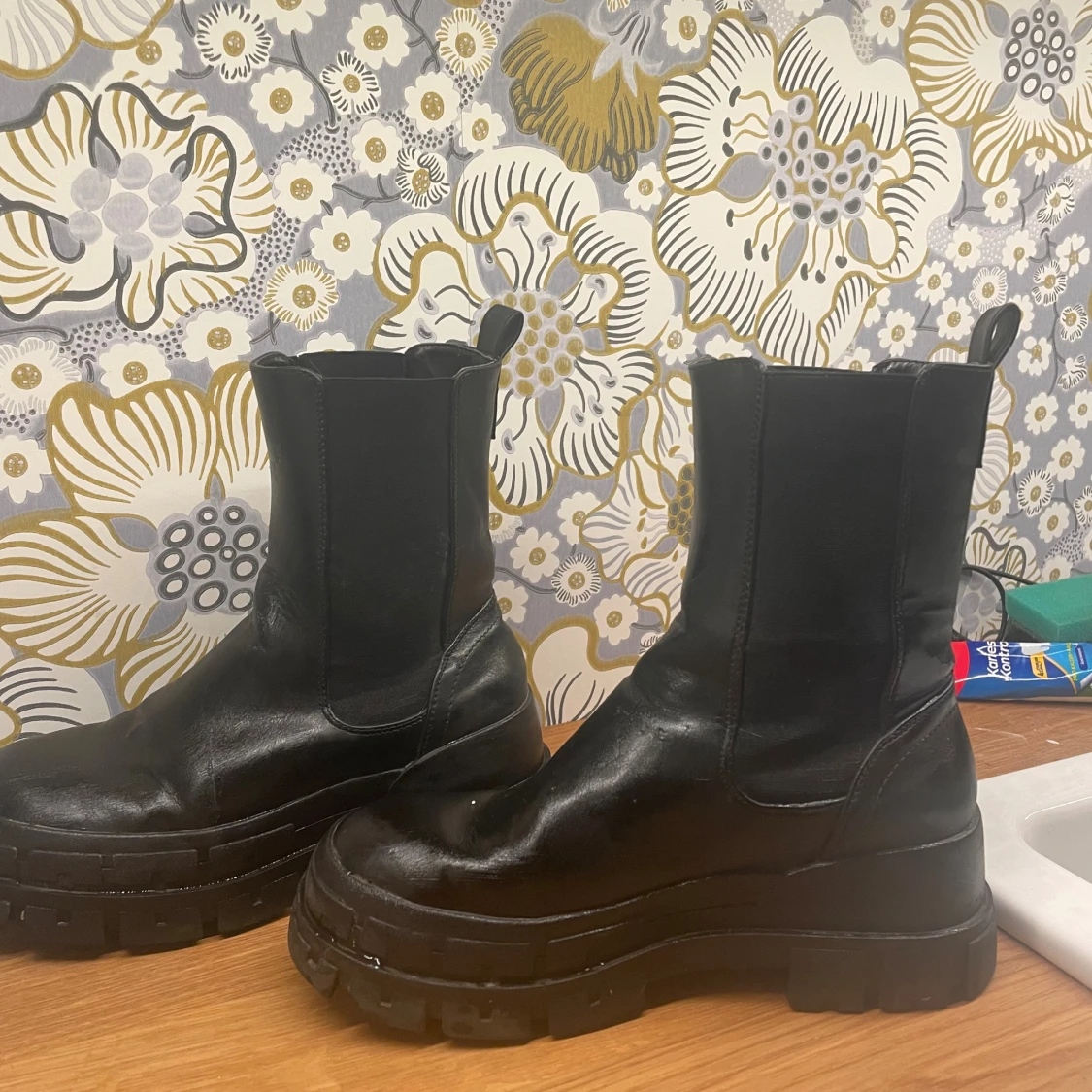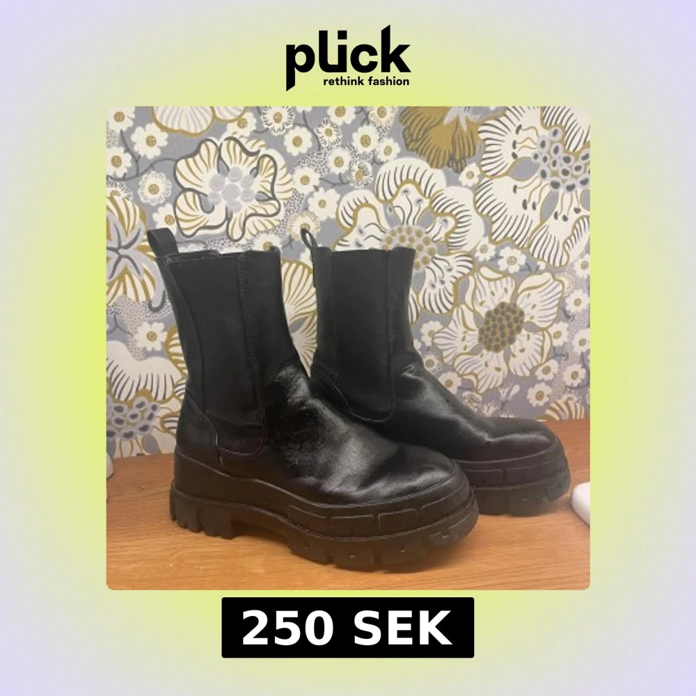 Säljer ett par svarta Even& oss boots med chunky sula och rund tå. Skorna är i skinn och har elastiska paneler på sidorna för enkel påtagning. Perfekta för dig som vill ha en edgy och trendig look till höst och vinter.