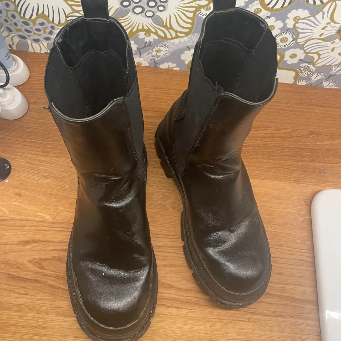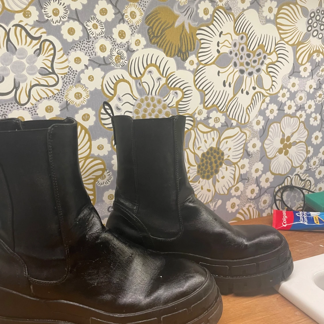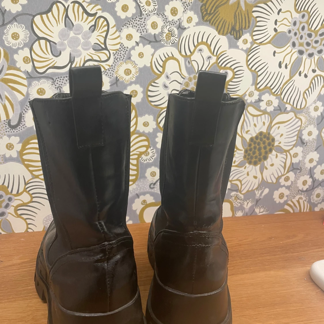Säljer ett par svarta Even& oss boots med chunky sula och rund tå. Skorna är i skinn och har elastiska paneler på sidorna för enkel påtagning. Perfekta för dig som vill ha en edgy och trendig look till höst och vinter.