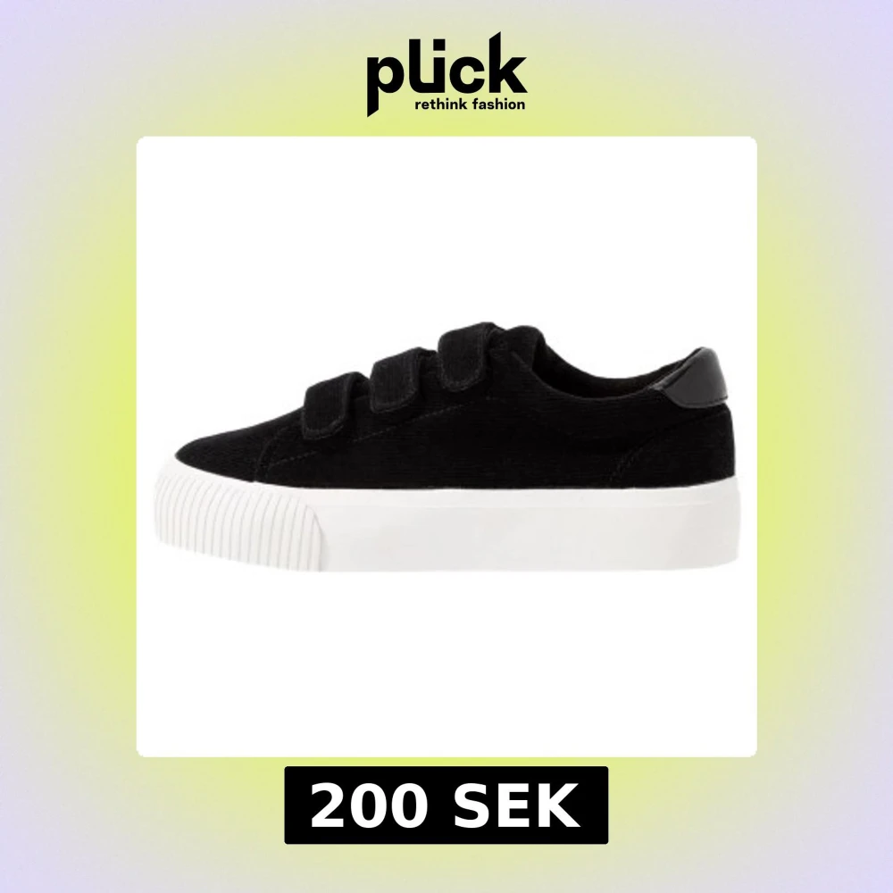 Stilrena svarta sneakers med bred vit platt sula och tre smidiga kardborreband. Ovandelen är i manchestertyg. Skorna är aldrig använda.
