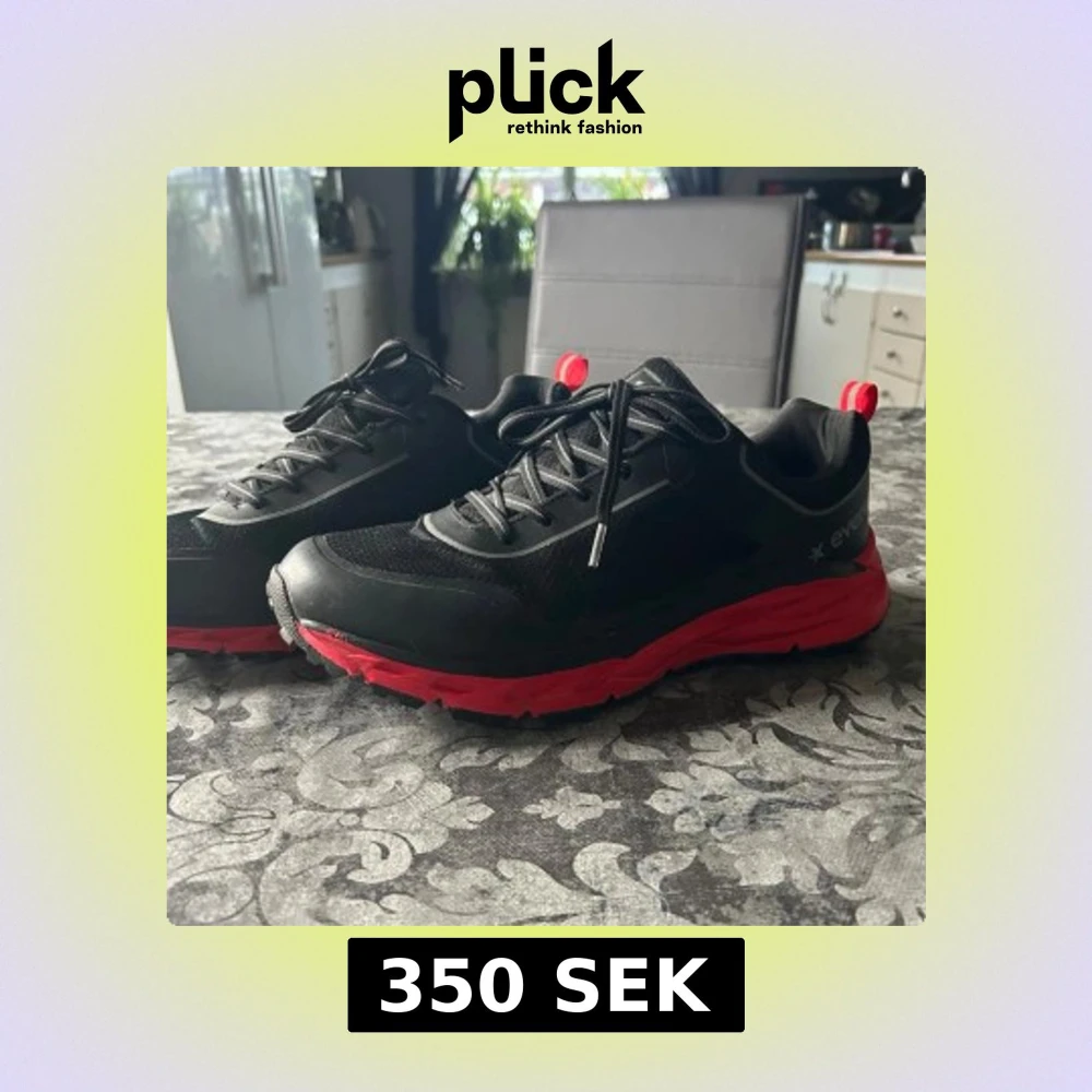 Snygga svarta sneakers med röda detaljer och snörning. Skorna har en robust sula och är perfekta för en aktiv livsstil. De har en modern design med en kombination av olika material för extra komfort och stil. Dom är i princip helt oanvända.
