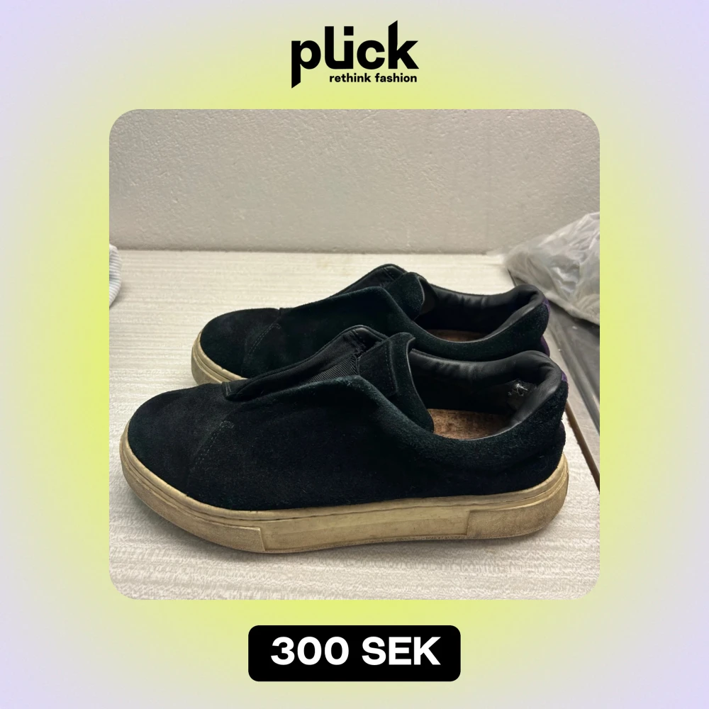 Säljer ett par svarta sneakers i mocka med en cool lila detalj på hälen. De har en sliten look på sulan och små skavanker i hälen men inget som stör, men är fortfarande i bra skick. Perfekta för en avslappnad stil och funkar året runt. Sköna att ha på sig och lätta att matcha med olika outfits.