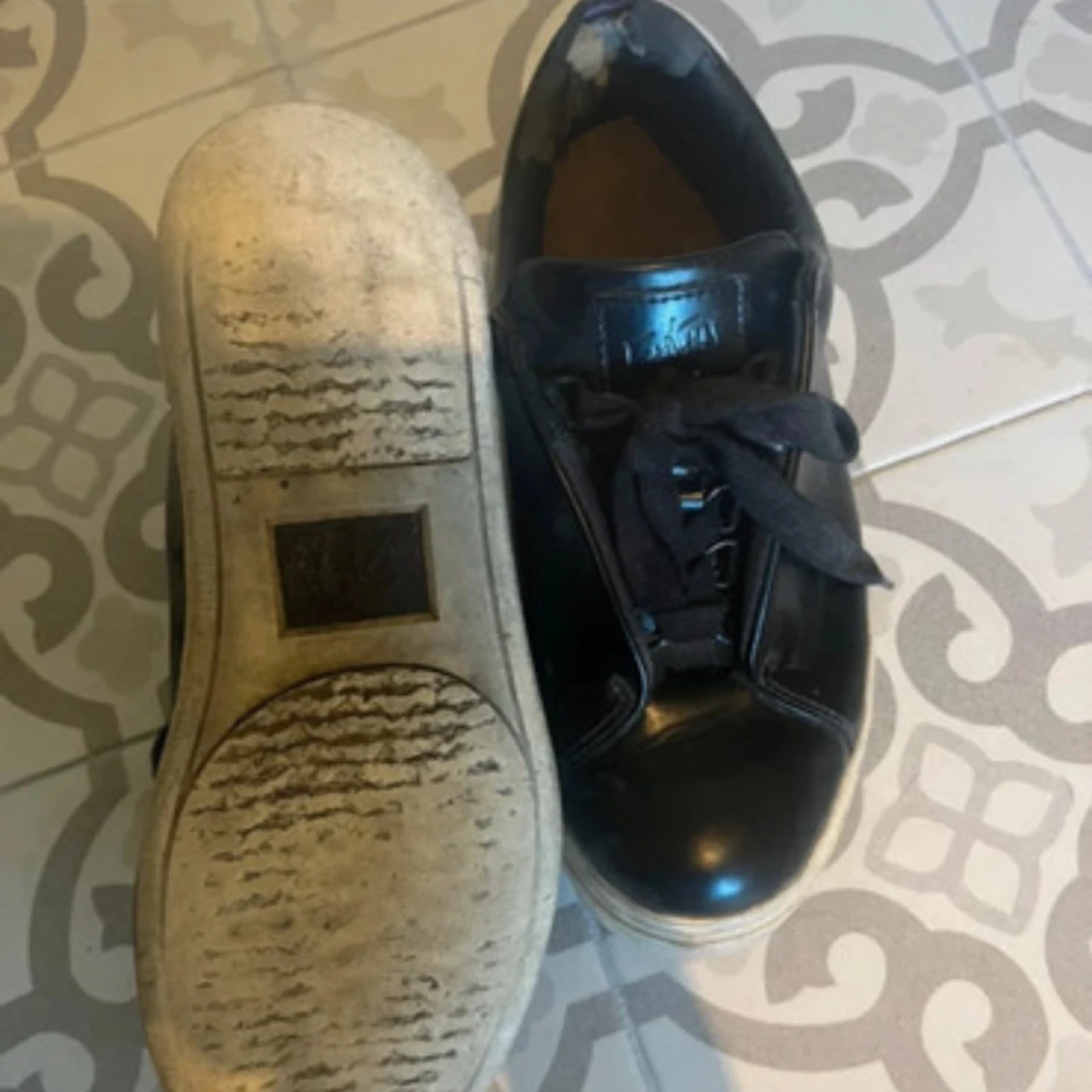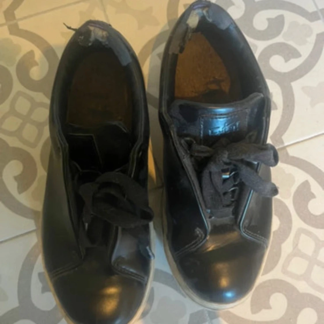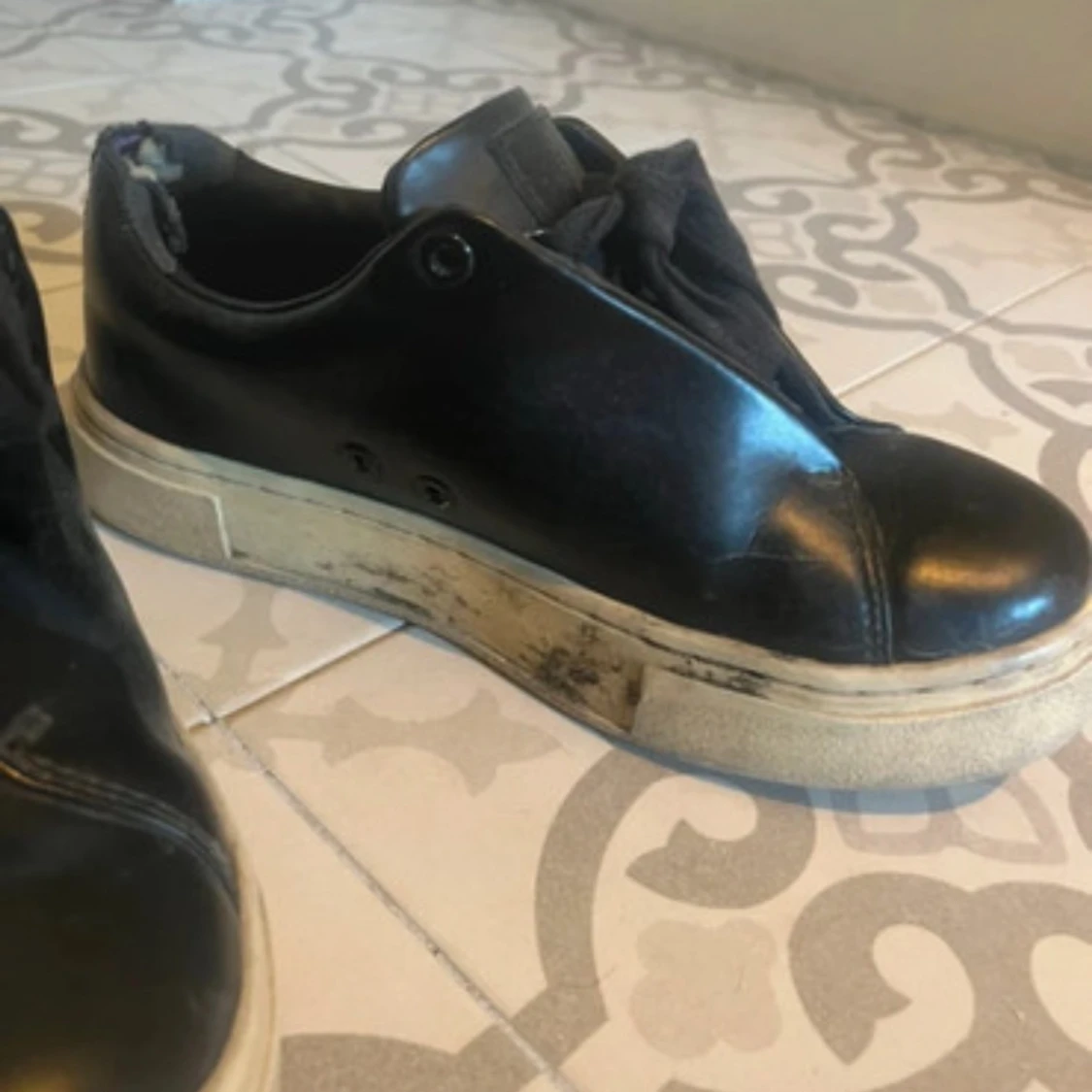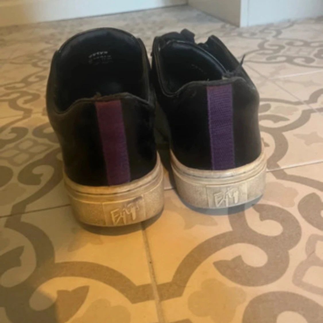 Svarta sneakers från Eytys med platt vit sula och lila detalj baktill. Skorna har snörning och är tillverkade i skinn. Klassisk rund tå och diskret logga på hälen. Perfekta för dig som gillar stilrena och chunky sneakers. alla är lånade bilder från hon jag köpte ifrån. skorna ser exkat ut så och jag själv har inte använt dem.