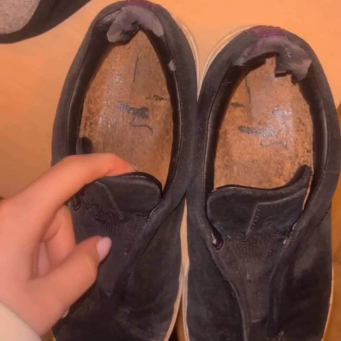 Säljer ett par svarta sneakers i mocka med vit sula. Skorna har en stilren design utan snörning, vilket ger dem ett minimalistiskt utseende. Perfekta för en avslappnad stil.