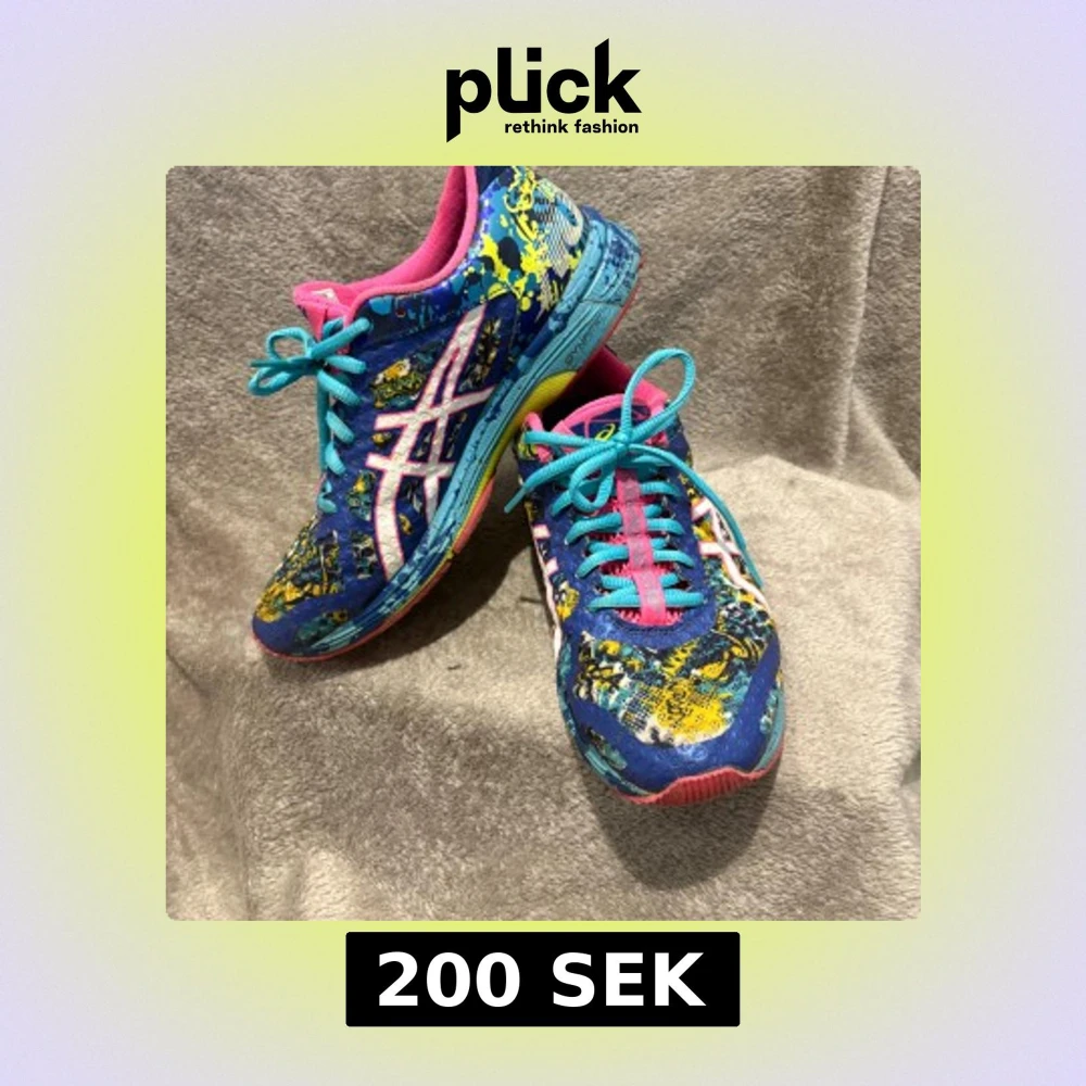 Säljer ett par riktigt coola Asics sneakers med blå bas och färgstänk i gult, rosa och turkos. Skorna har snörning, rosa innersula och vit Asics-logga på sidan. Sulan är rosa och blå med detaljer i gult. Perfekta för dig som gillar att sticka ut!