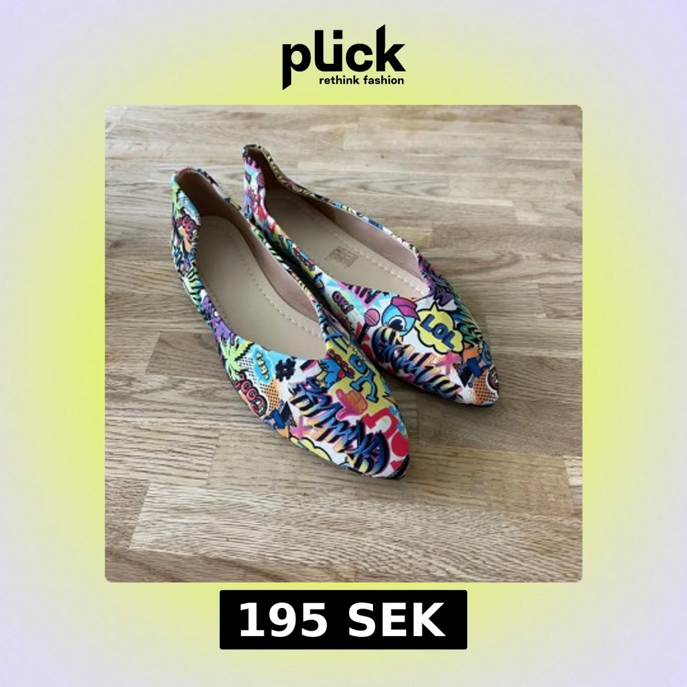Säljer ett par ballerinaskor med färgstarkt serietidningsinspirerat mönster i blått, gult, rött och grönt. Skorna har spetsig tå och platt sula, perfekta för dig som vill sticka ut med din stil.Helt nya eu storlek 39