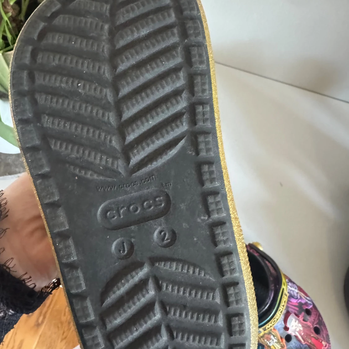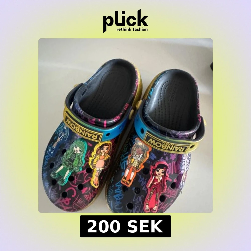 Unika Crocs med Rainbow High-tema, dekorerade med färgglada figurer och graffiti-liknande mönster. Skorna har svart bas med inslag av blått, gult och rosa samt glittrig guldkant runt sulan. FÖR BARN