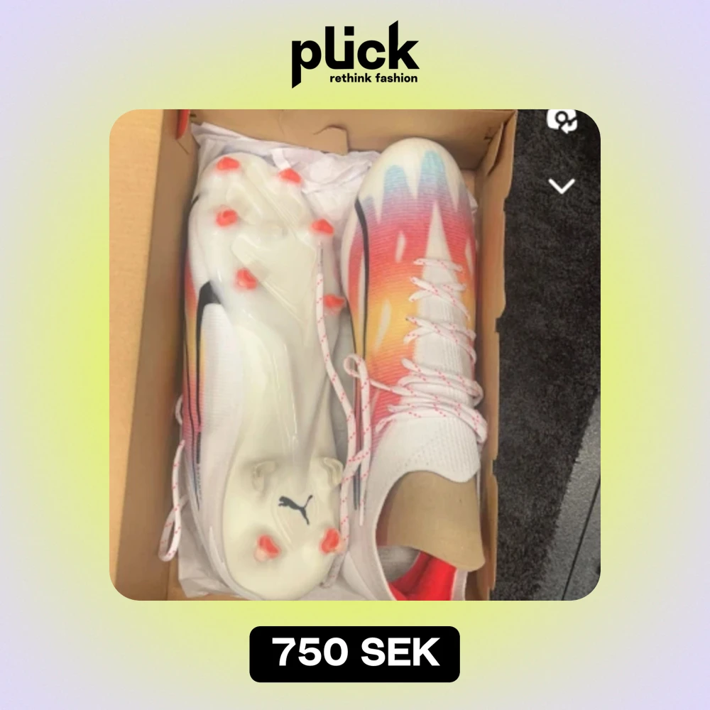 Säljer ett par riktigt snygga fotbollsskor från Puma. De har en cool färgkombination av vit, röd, orange och blå med ett häftigt mönster. Skorna har snörning och är perfekta för fotbollsspel på gräs. Sulan har röda dobbar för extra grepp.
