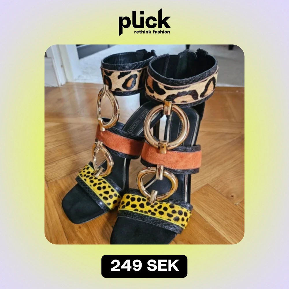 Ett par eleganta klackskor från River Island med en unik design. Skorna har flera färger och mönster, inklusive leopardmönster på remmarna och guldfärgade ringdetaljer. De har en dragkedja på baksidan för enkel på- och avtagning.