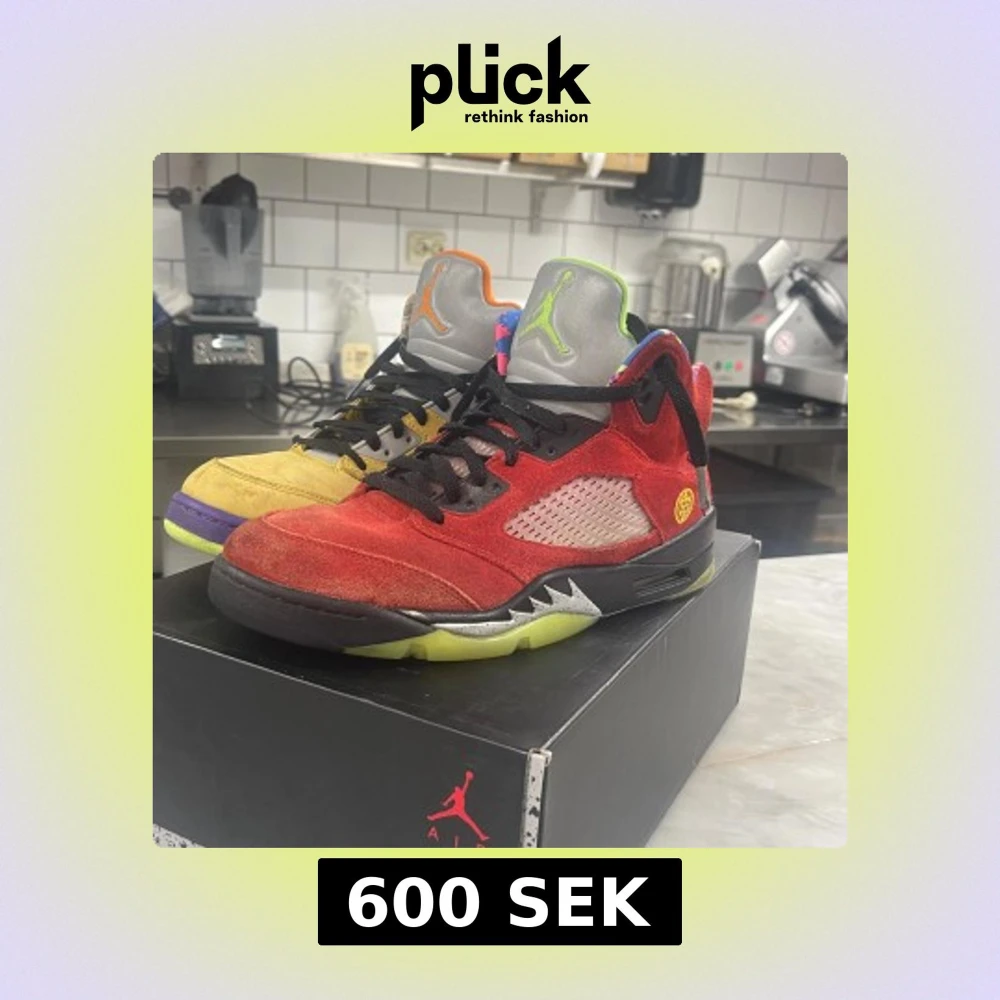 Unika Nike Air Jordans 5 What the i olika färger. Ena skon är röd med svarta detaljer och grön sula, medan den andra är gul med lila sula. Båda har snörning och ikoniska Jumpman-loggan på plösen. Storlek: 43