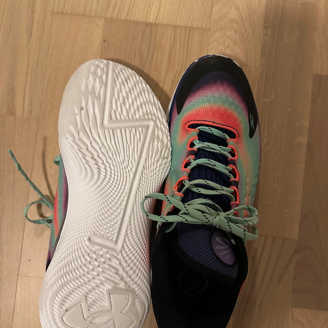 Säljer ett par riktigt färgstarka Under Armour sneakers med coolt gradientmönster i grönt, rosa, lila och svart. Skorna har snörning, vit sula och ventilerande meshmaterial. Perfekta för dig som vill sticka ut på gymmet eller i vardagen.