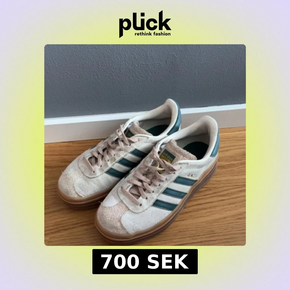Säljer ett par Adidas Gazelle sneakers i beige mocka med klassiska gröna ränder och detaljer. Skorna har bold gummisula i brunt och beige snörning.