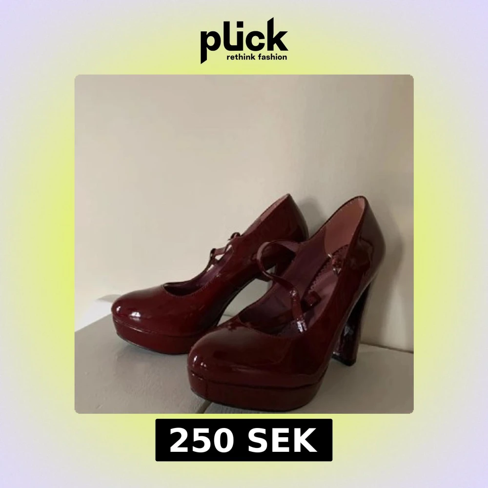 Säljer ett par vinröda pumps i glansigt lackmaterial med rund tå och hög klack. Skorna har en smal rem över foten som ger en klassisk Mary Jane-look. Ganska små i storleken så skulle tipsa om att köpa dem om man har storlek 36…💕