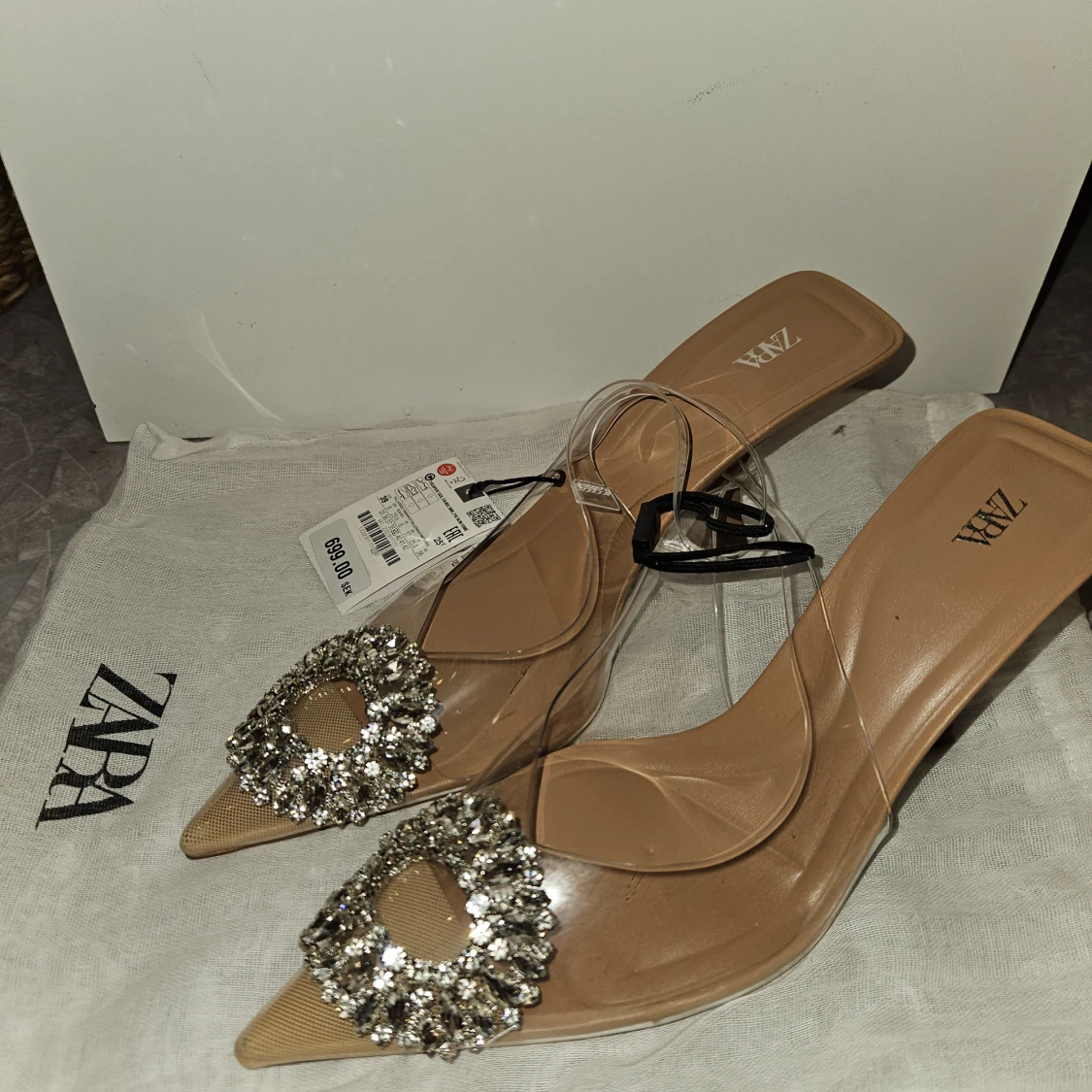 Superfina skor från zara aldrig använda. Sitter snyggt på foten Hudfärgade med förstärkning vid tårna. Är storlek 39 men känns som en 38a.