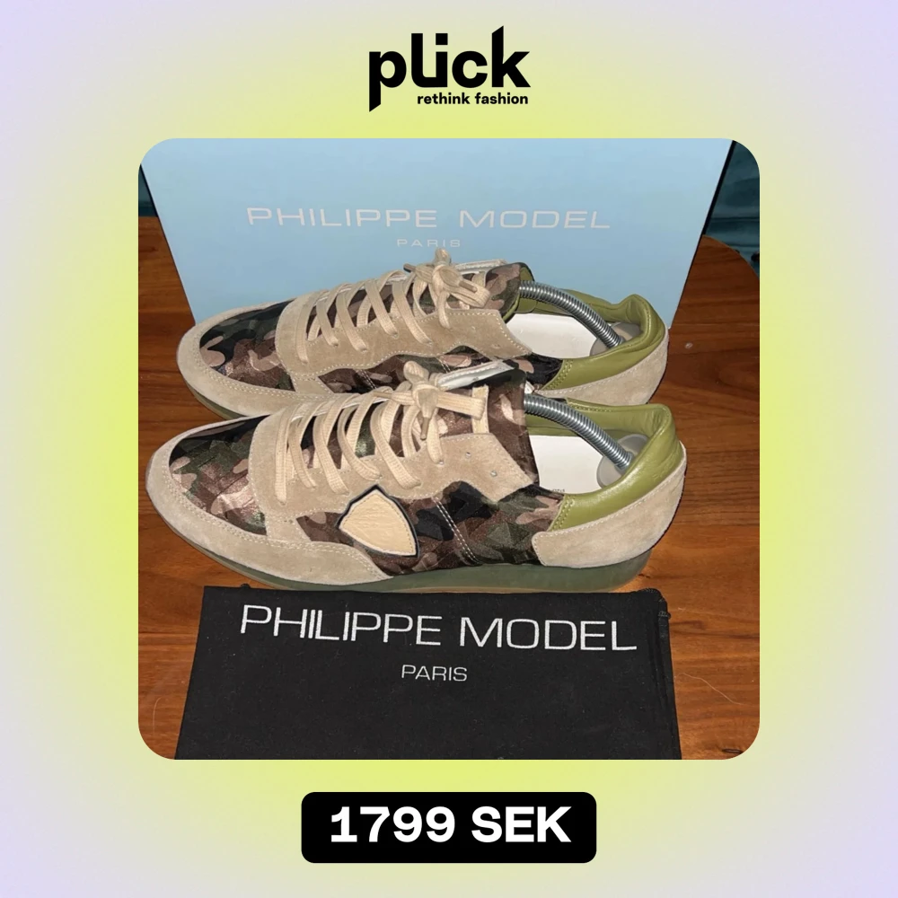 Säljer ett par snygga trainers från Philippe Model i camouflage-mönster. Skorna har beige mockadetaljer och en olivgrön häl. De är i princip nytt skick, använda några fåtal gånger och perfekta för både vardag och fest, samt perfekta för vinter och sommar. Skorna har snörning och en bekväm sula för extra komfort. Sista bilden är hur de sitter på. Skriv gärna om ni har några funderingar och ge gärna pris förslag🤗🤝