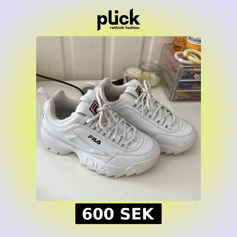 Snygga vita sneakers från Fila med en chunky sula och klassisk snörning. Skorna har Fila-loggan på sidan och tungan, vilket ger en sportig look. Perfekta för en casual stil. Dem är använda ca 3 gånger. Priset kan diskuteras vid snabb affär