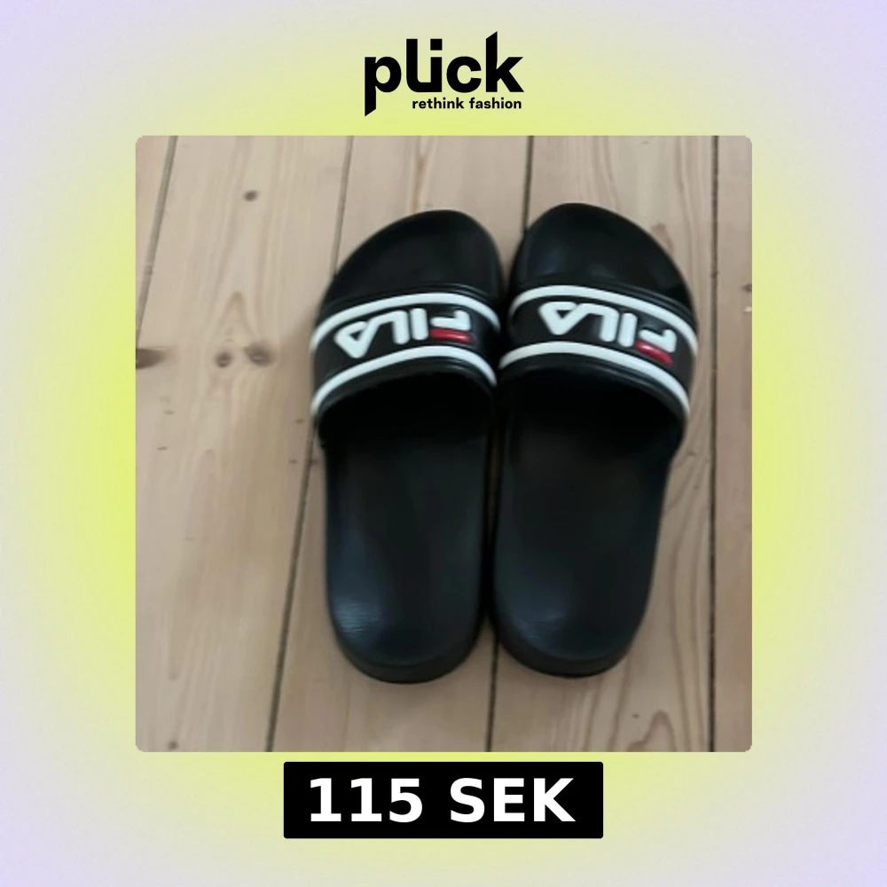 Svarta sandaler från Fila med vit och röd logga på remmen. Klassisk slip-on modell med bred rem över foten och platt sula. Perfekta för sommaren eller att ha hemma.