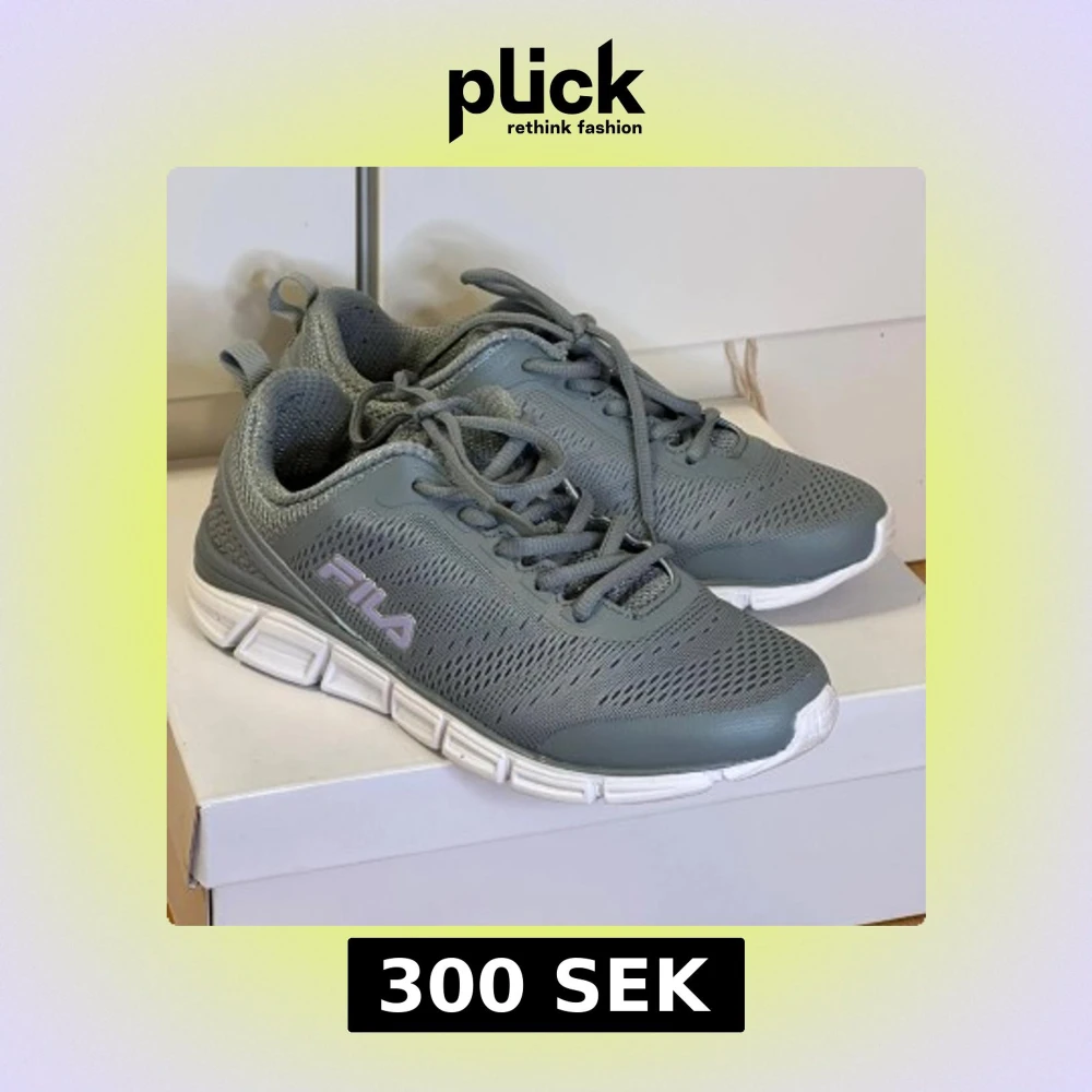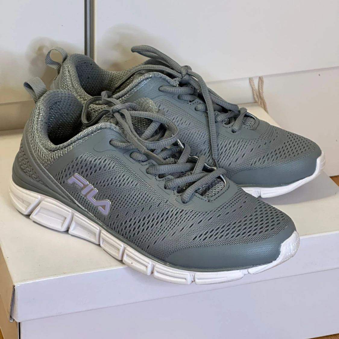 Snygga grå sneakers från Fila med vit sula och snörning. Skorna har en sportig design med ventilerande meshmaterial och Fila-logga på sidan. Perfekta för en aktiv livsstil.