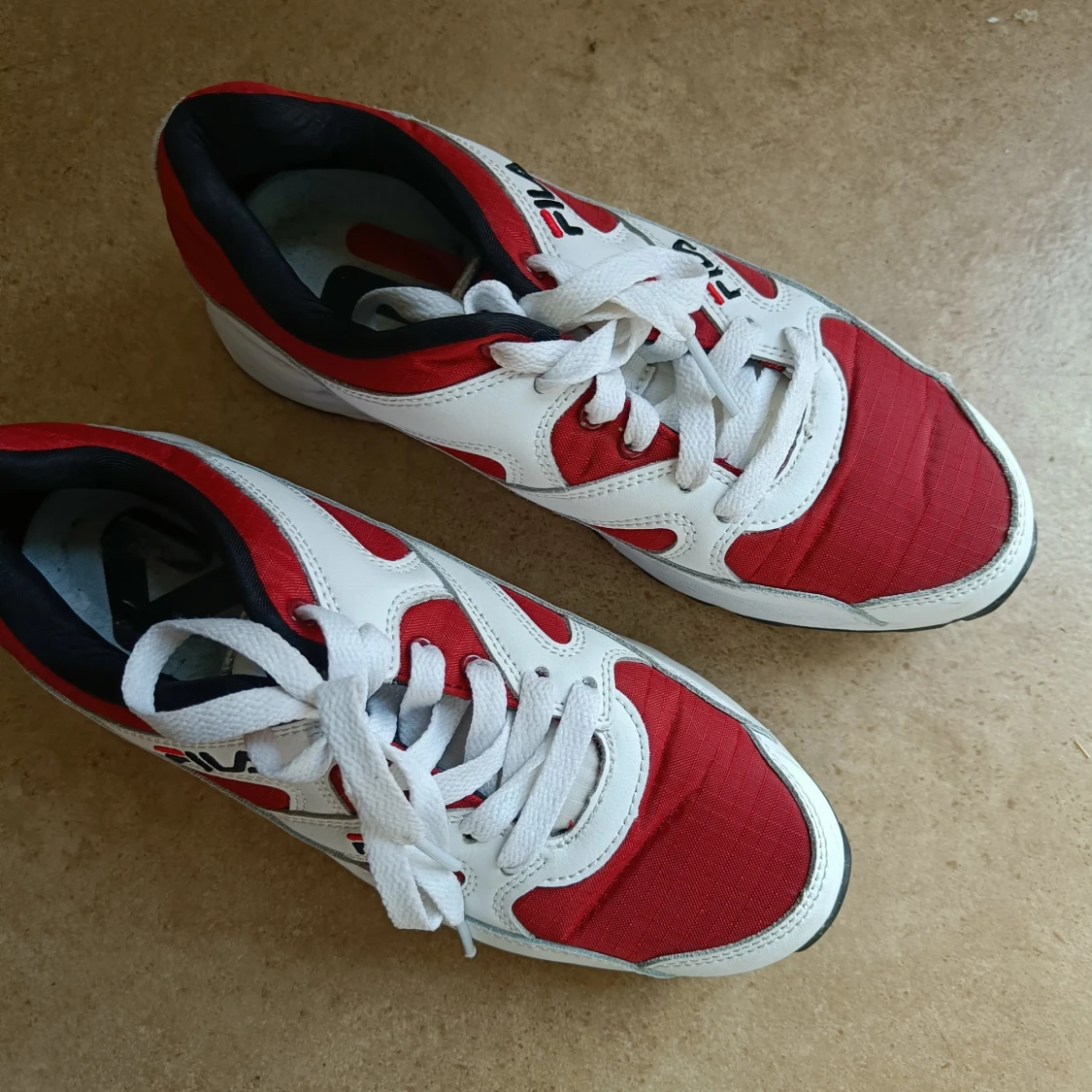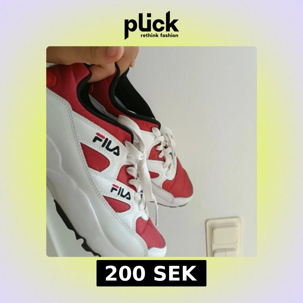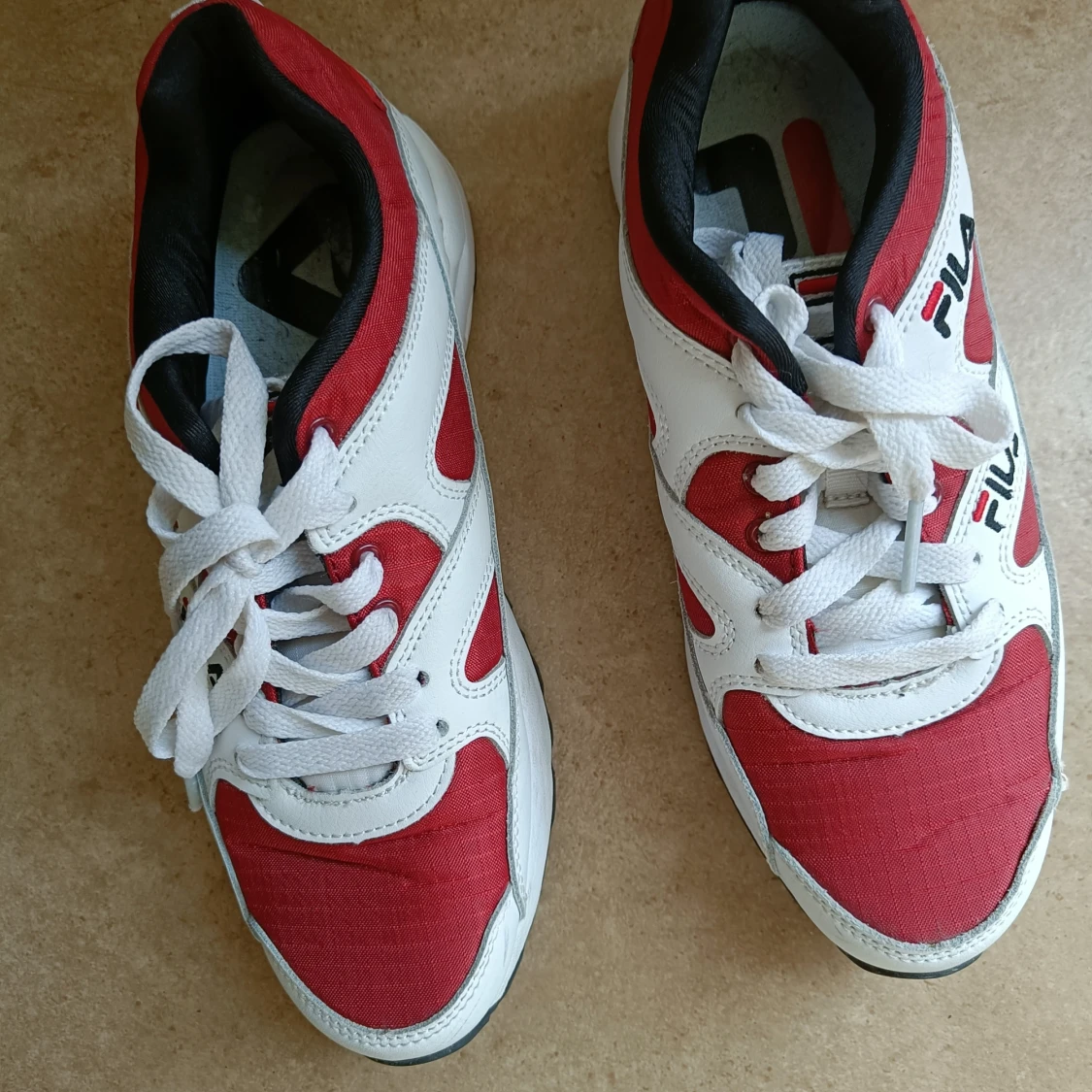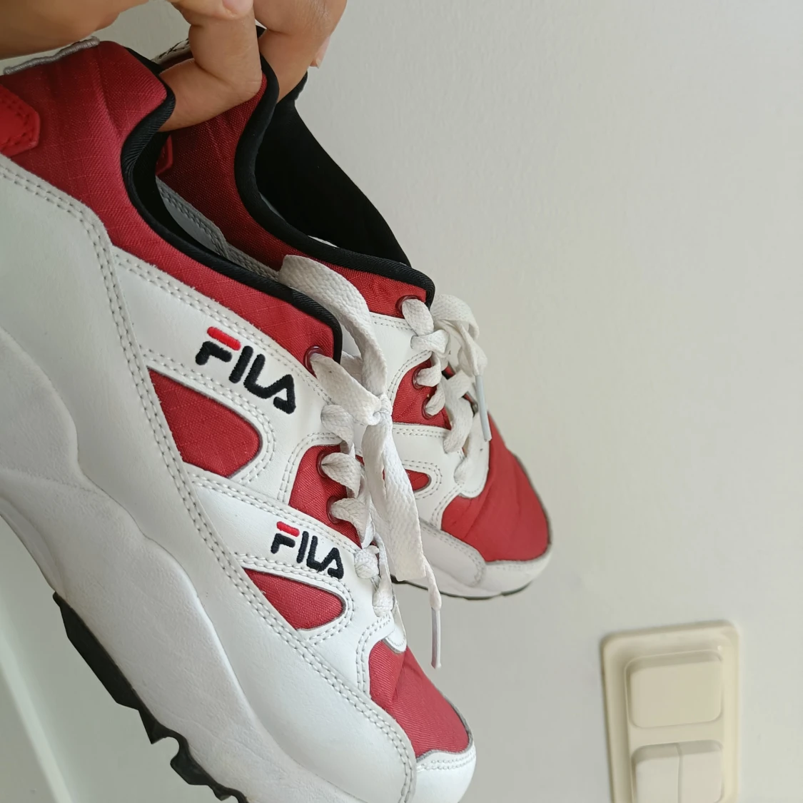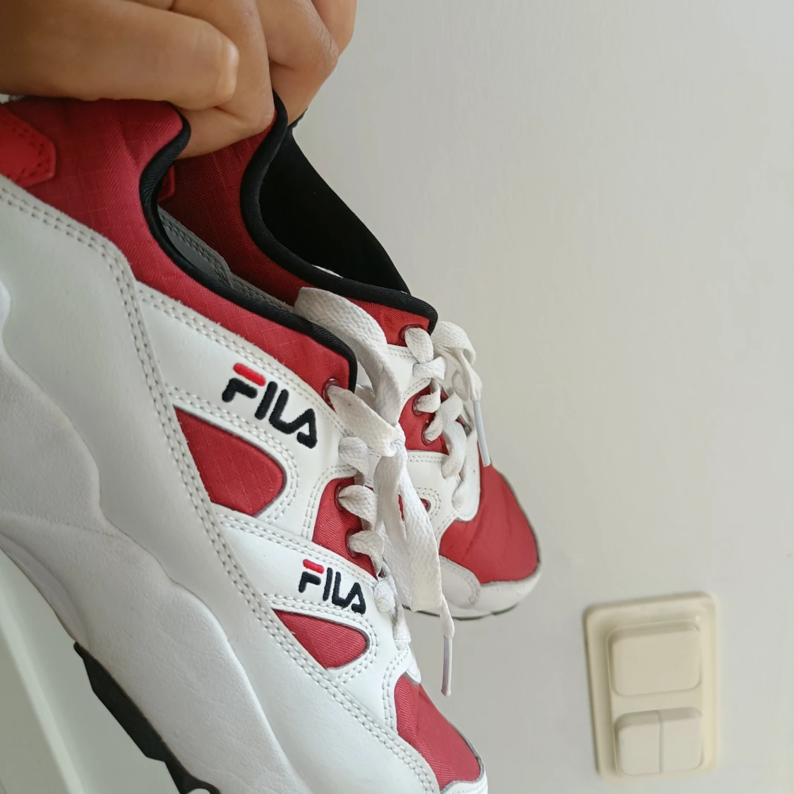 Snygga sneakers från FILA i rött och vitt med svarta detaljer. Skorna har en chunky sula, vit snörning och klassisk logga på sidan. Ovandelen är i textil och syntet med coola paneler och sportig vibe. Perfekta för dig som gillar streetstyle och vill sticka ut.
