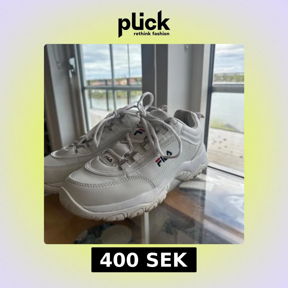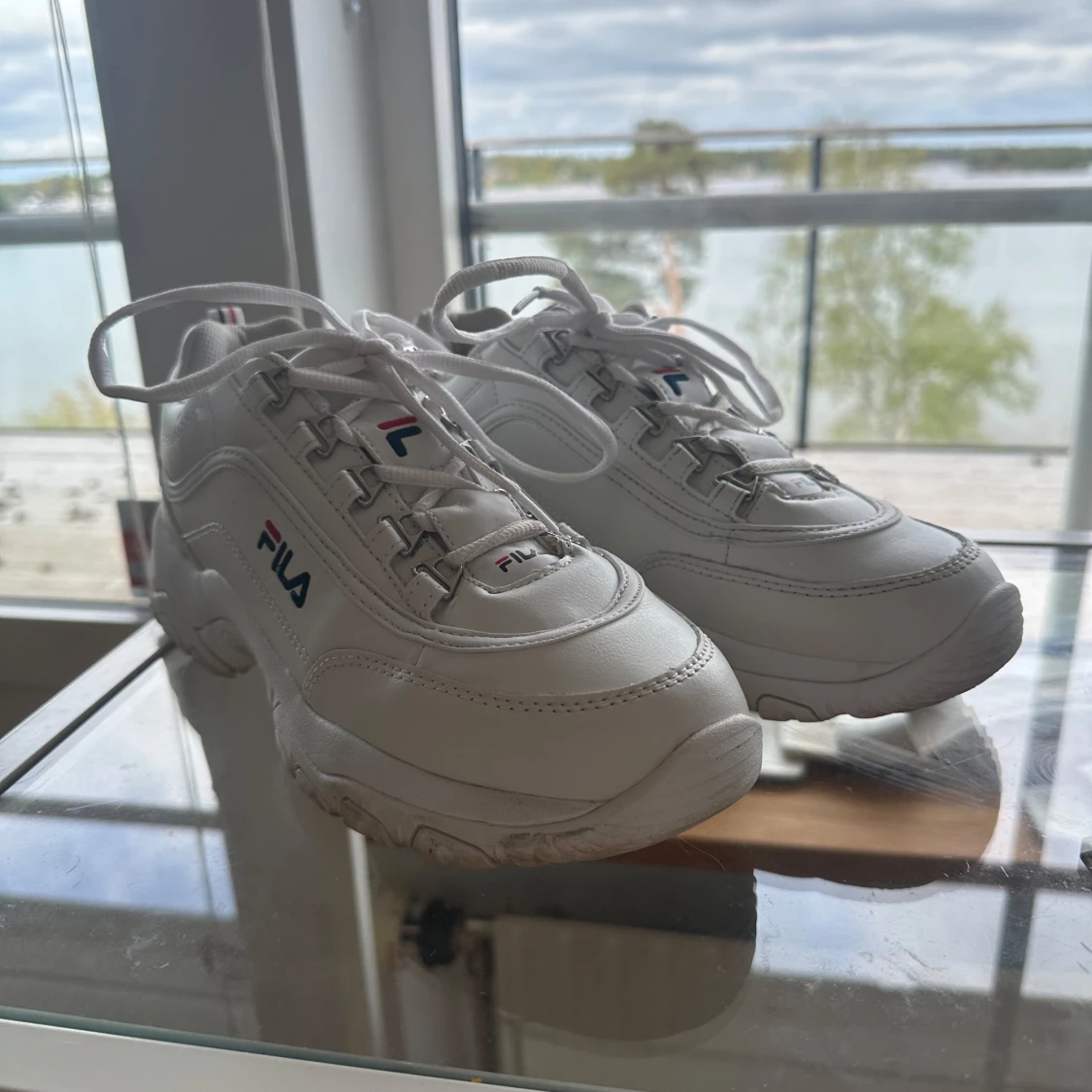 Säljer ett par klassiska vita sneakers från Fila med chunky sula och snörning. Skorna har Fila-logga på sidan, plösen och hälen. Perfekta för en sportig och trendig look.