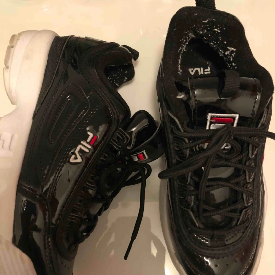 Säljer mina Fila Chunky sneakers i svart glans som dessutom är fodrade. Haft under ett år men bara använt ett fåtal gånger ⚡️
