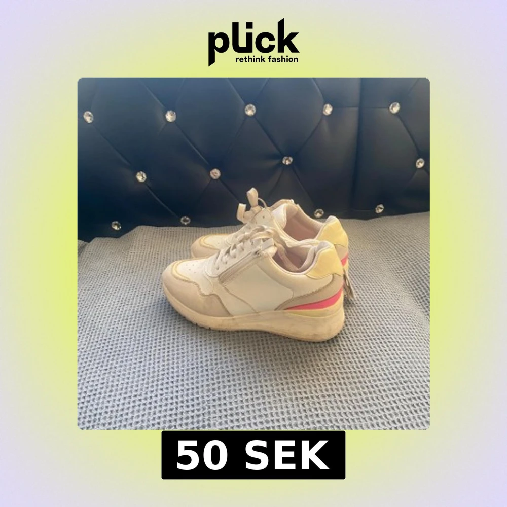Säljer ett par chunky sneakers i vitt med beige och ljusgula inslag samt en snygg rosa rand på hälen. Skorna har snörning, rund tå och platt sula. Materialmix av syntet och mocka-look. Perfekta för dig som gillar en sportig och trendig stil.