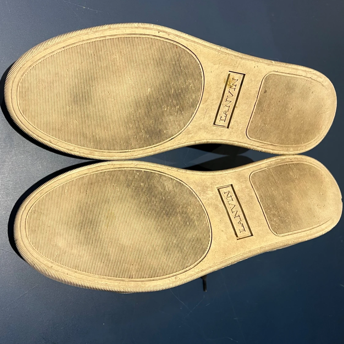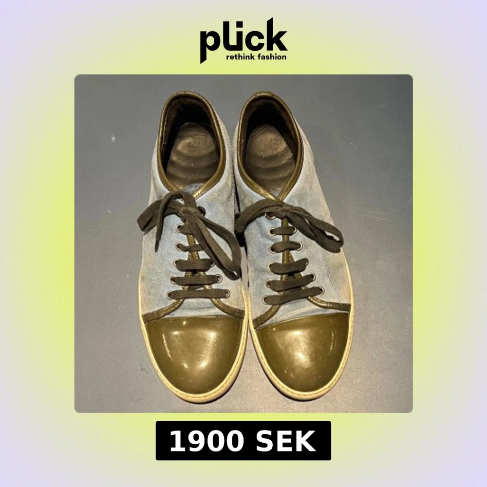 Snygga sneakers från Lanvin med blå mocka och olivgrön/grå blank tå. Skorna har rund tå med glansig tåhätta, svarta snören och beige/vit sula. Skorna kan absolut tvättas upp innan dem skickas och pris går att diskutera. Enda skönhets felet är en liten chip i hälen men inget man tänker på.