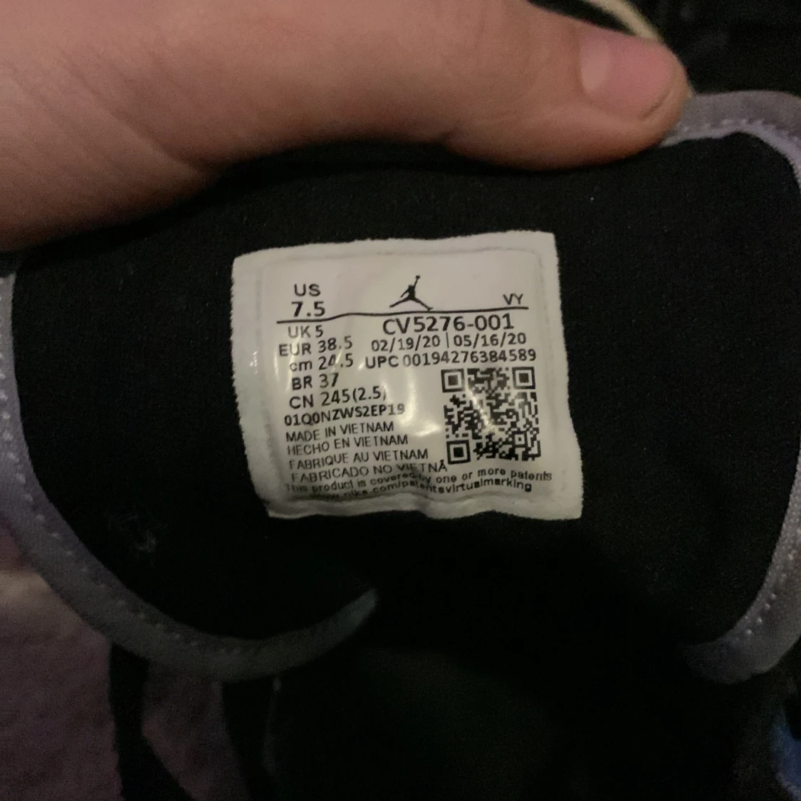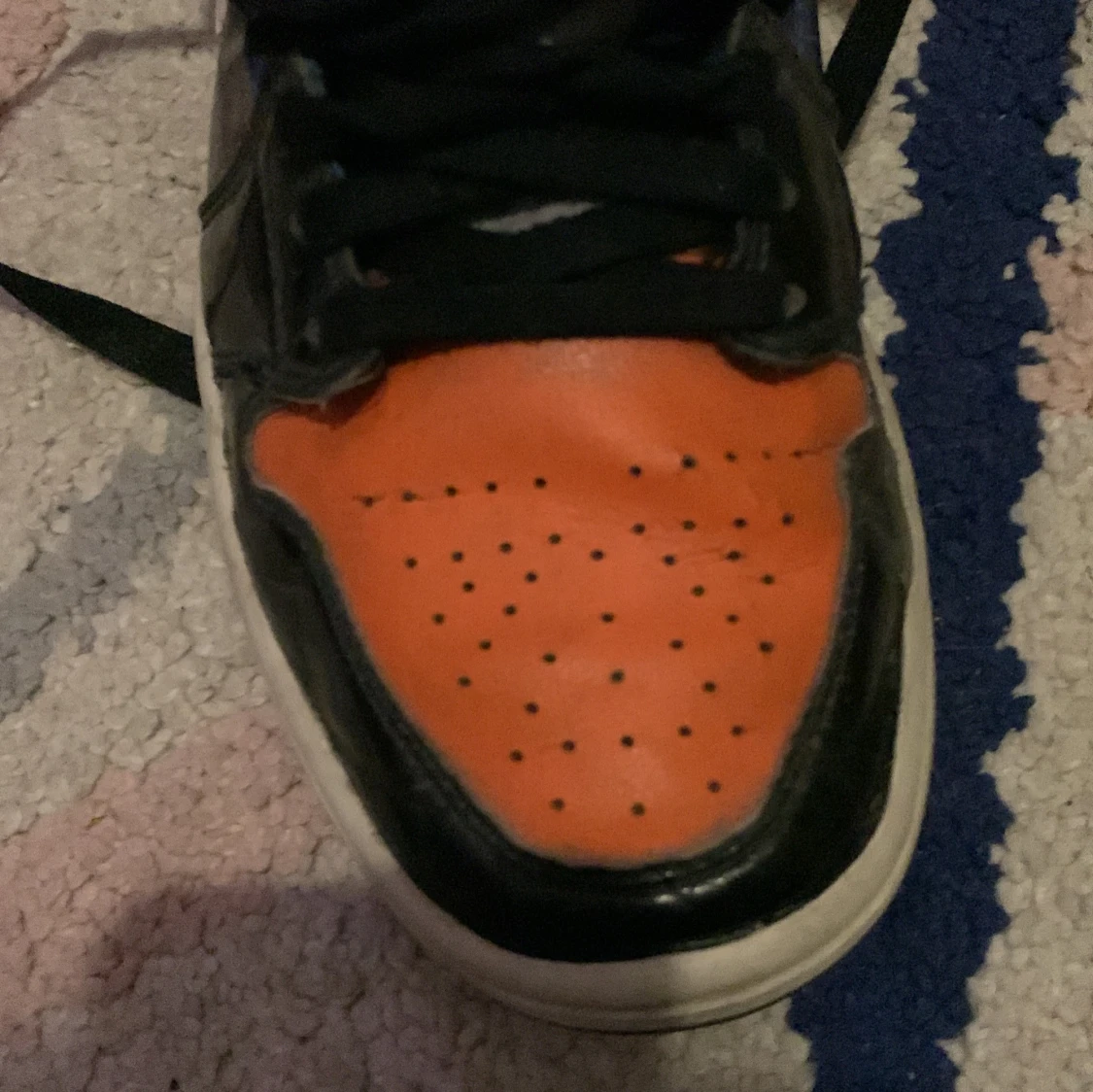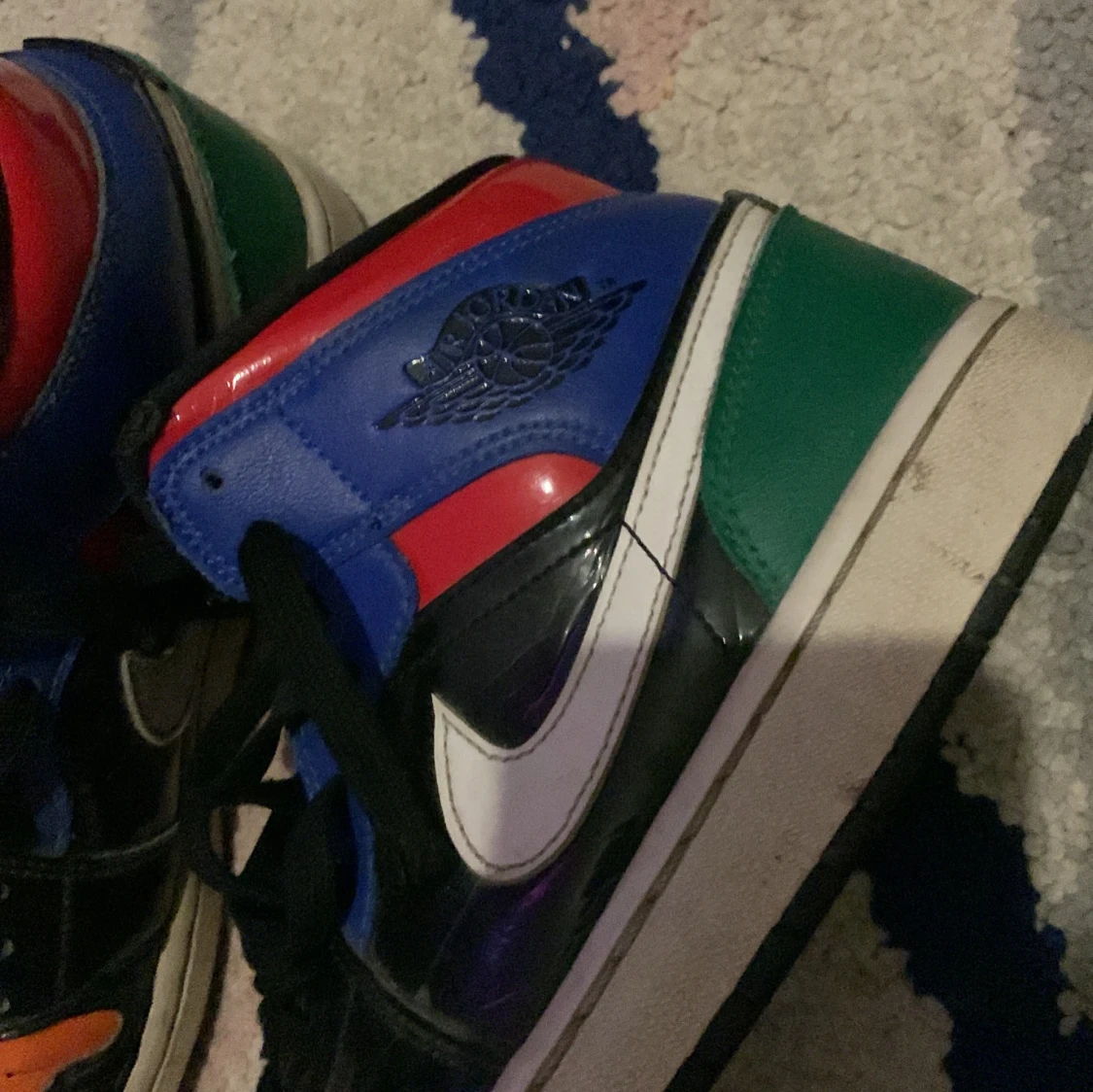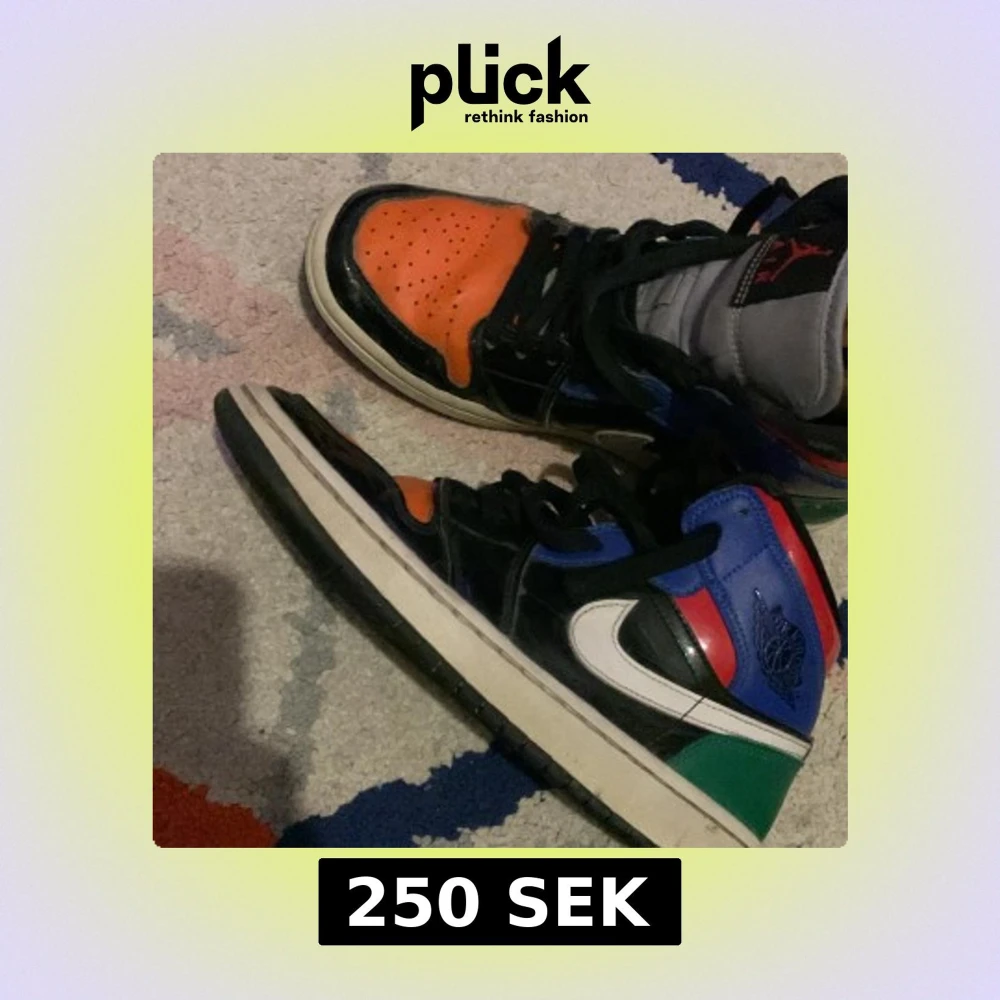 Säljer ett par unika Nike Air Jordans i flera färger: orange, blå, grön, röd och svart. Skorna har klassisk snörning och en vit sula. Perfekta för dig som vill sticka ut med en färgglad stil.