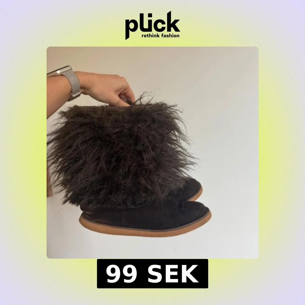 Unika bruna boots med superfluffig päls på skaftet och mjuk, vit fodring inuti. Yttermaterialet är mocka. Perfekta för dig som vill sticka ut och hålla dig varm under kalla dagar.