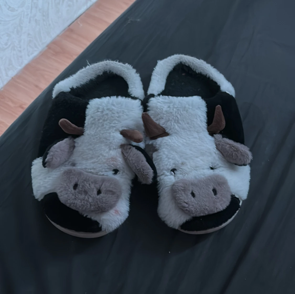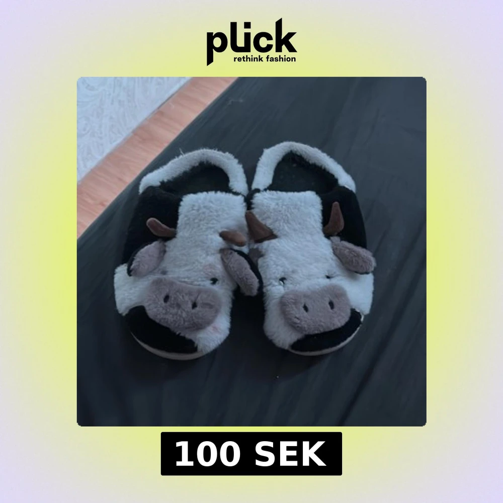 Supermysiga tofflor i svart och vitt med gulligt ko-ansikte, öron och horn framtill. Tillverkade i mjuk syntetpäls och med platt sula. Perfekta för att chilla hemma och hålla fötterna varma under kyliga dagar.