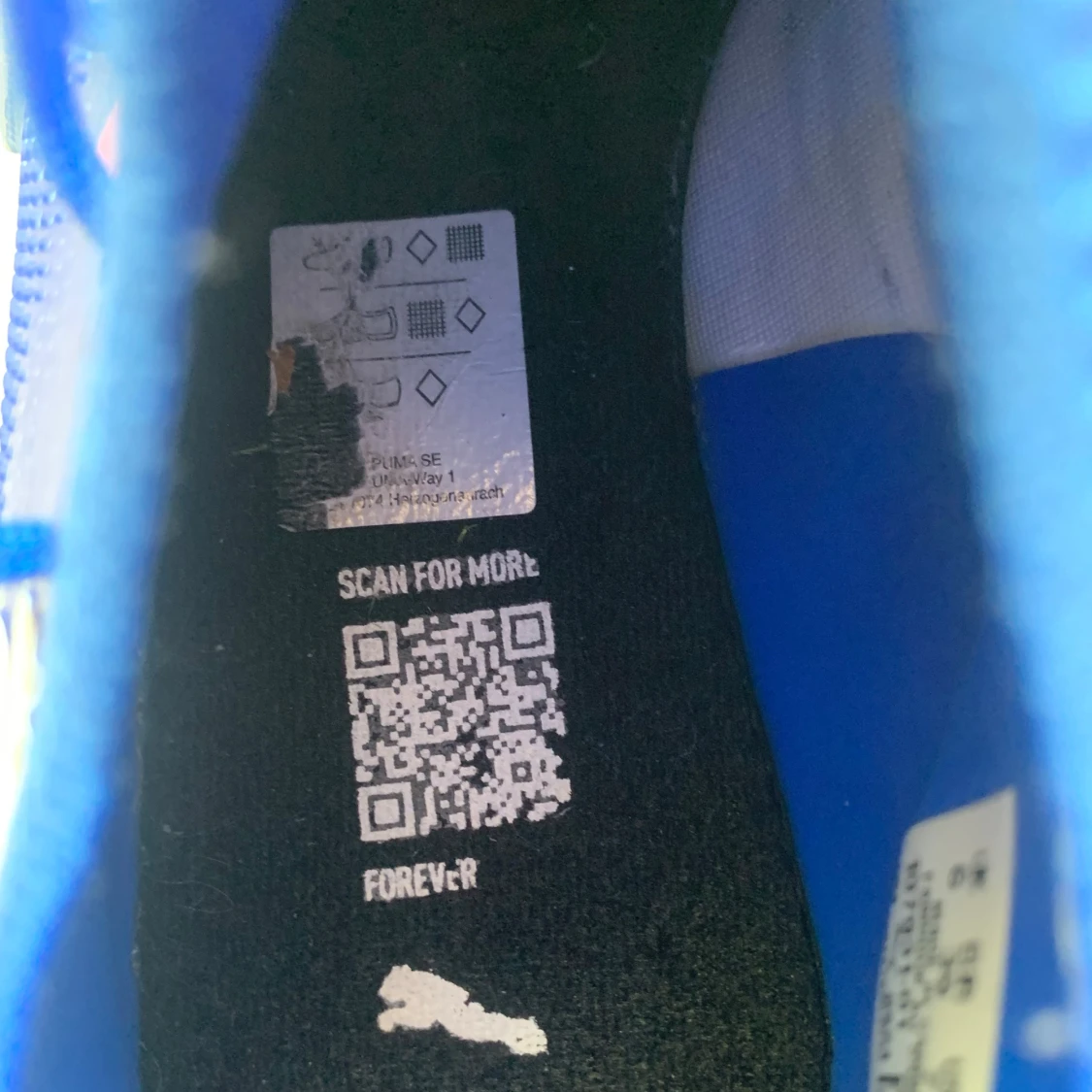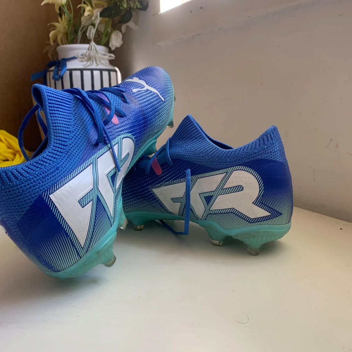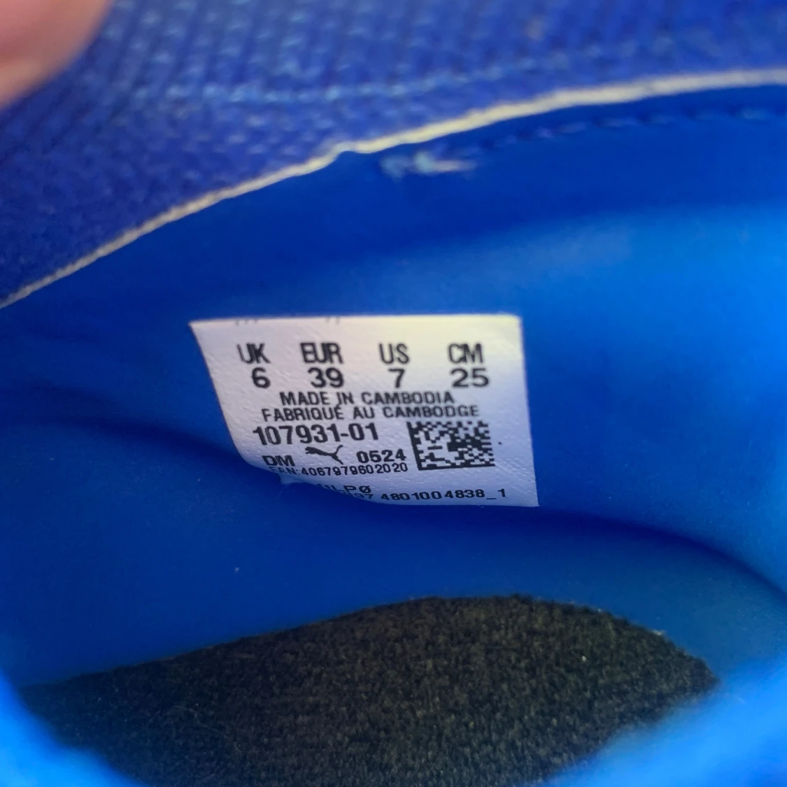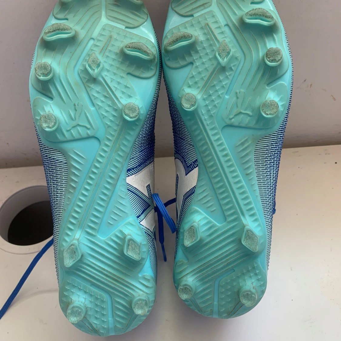 Snygga blåa fotbollsskor från Puma med vita detaljer och logga på sidan. Skorna har snörning, mönstrad ovandel i syntetmaterial och ljusblå dobbar för bra grepp på planen. Perfekta för dig som vill sticka ut på matchen! OBS box ingår inte.