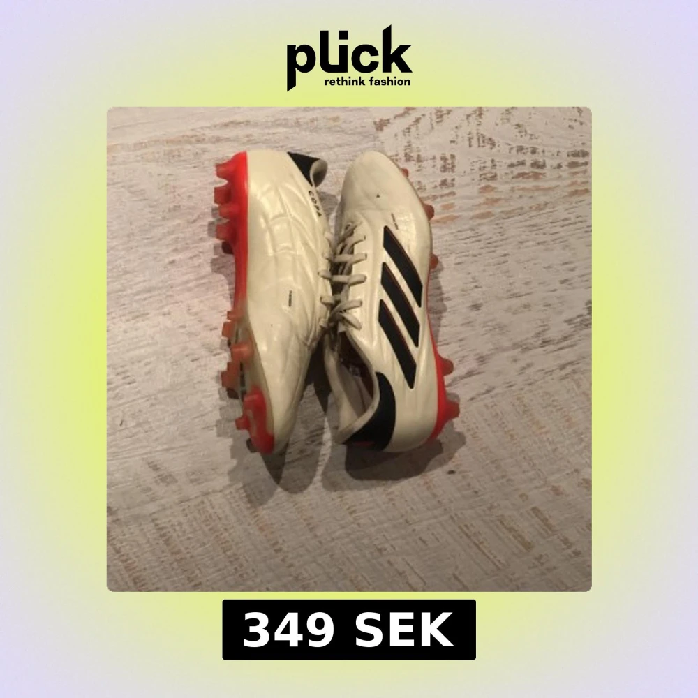 Säljer ett par vita Adidas fotbollsskor med svarta detaljer och röda dobbar. Skorna har snörning och är perfekta för fotbollsplanen. De är tillverkade i syntetmaterial och har en klassisk design med tre svarta ränder på sidan.