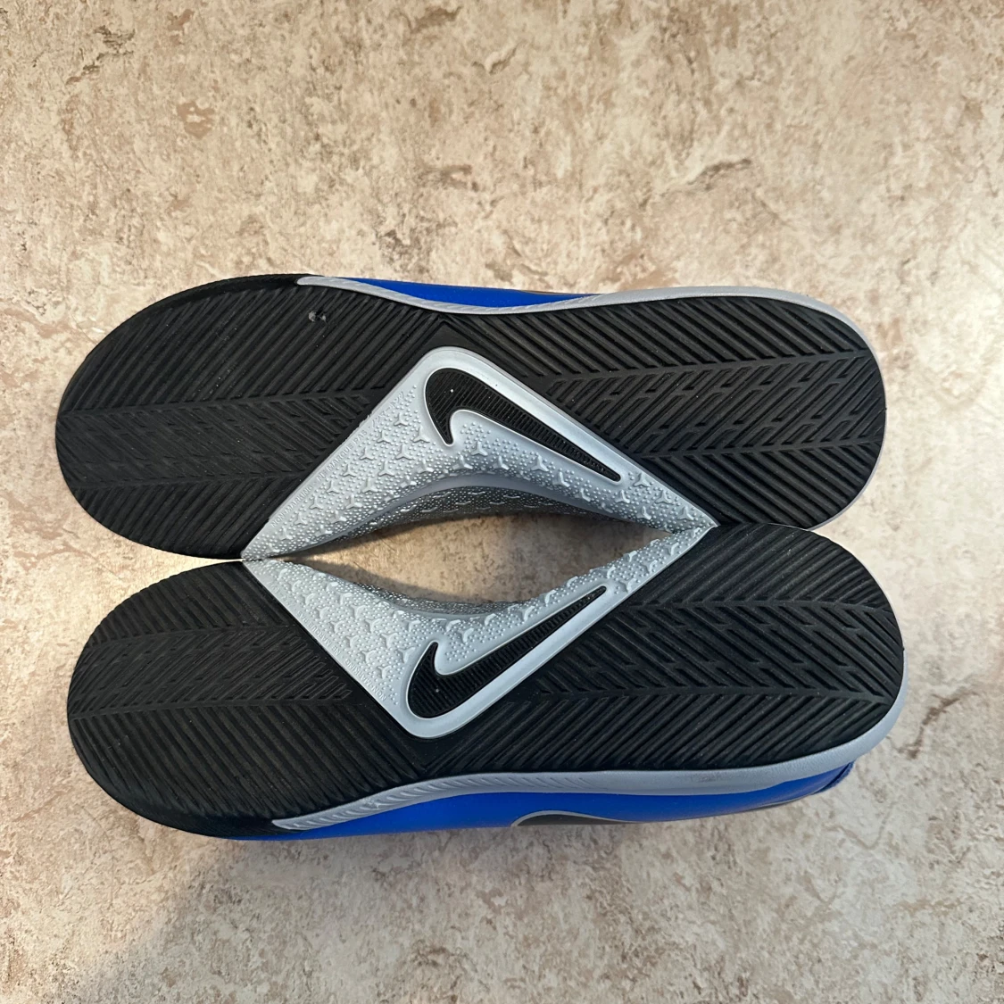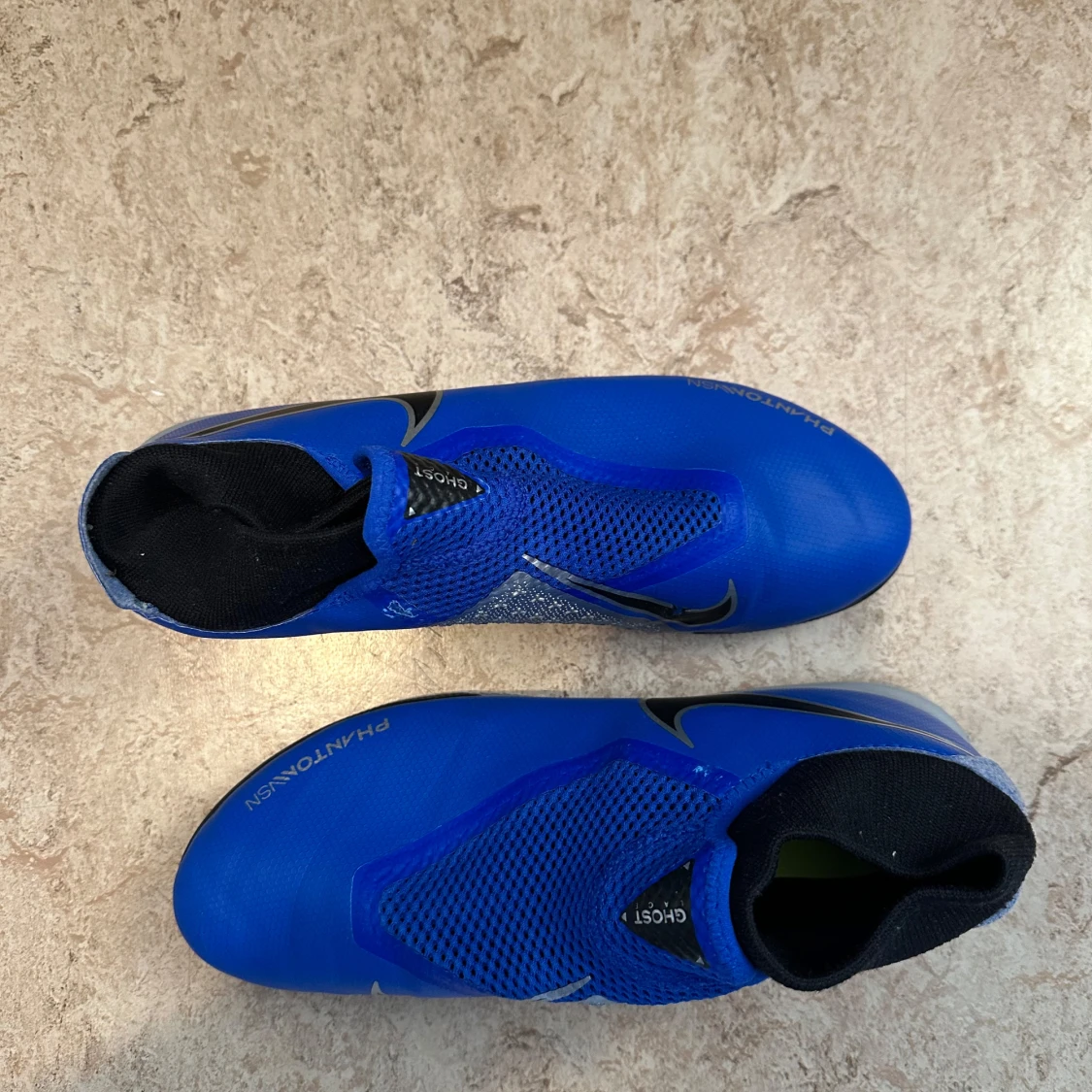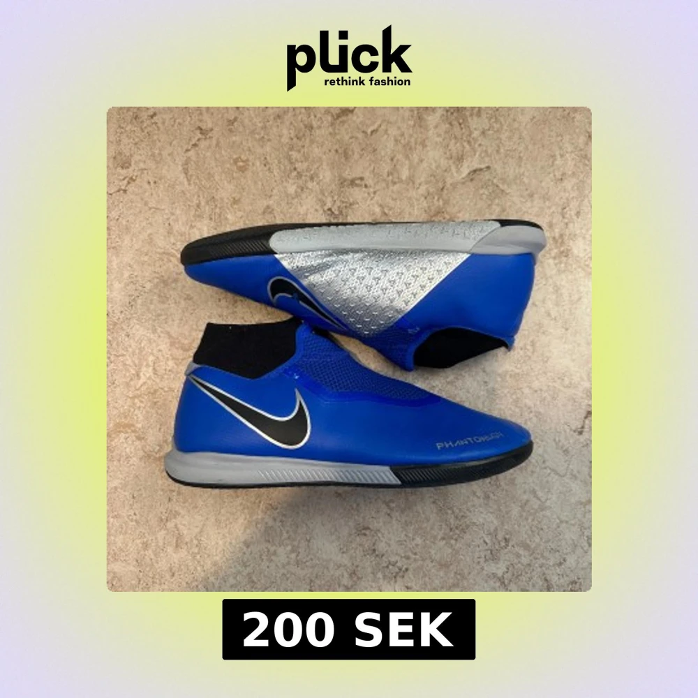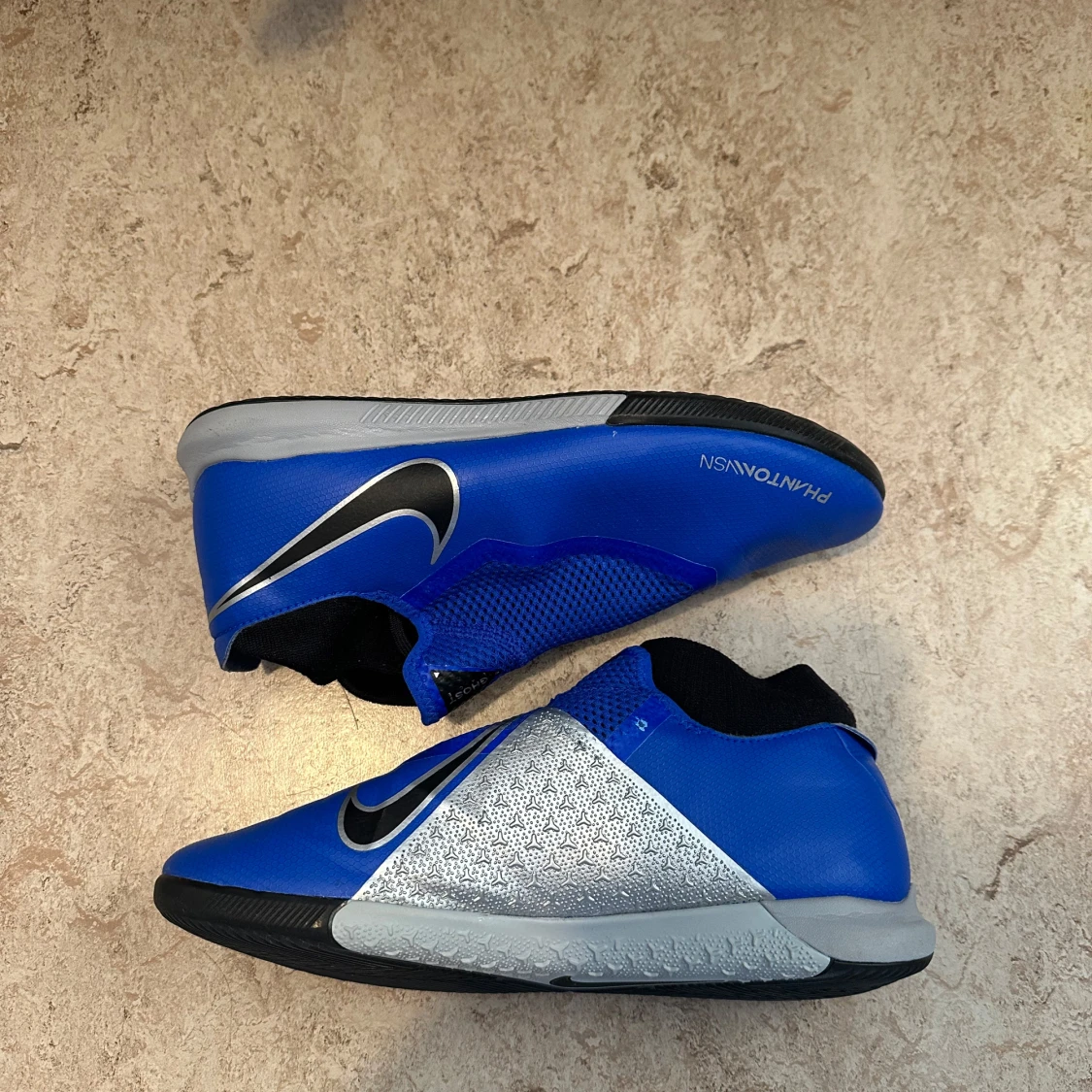 Nike Phantom Vision fotbollsskor i blått med silverdetaljer och svart sula. Skorna har en strumpliknande passform, meshpaneler och stora svarta swoosh-loggor. Ovandelen är i syntetmaterial och designen är modern och sportig, perfekt för inomhusspel.