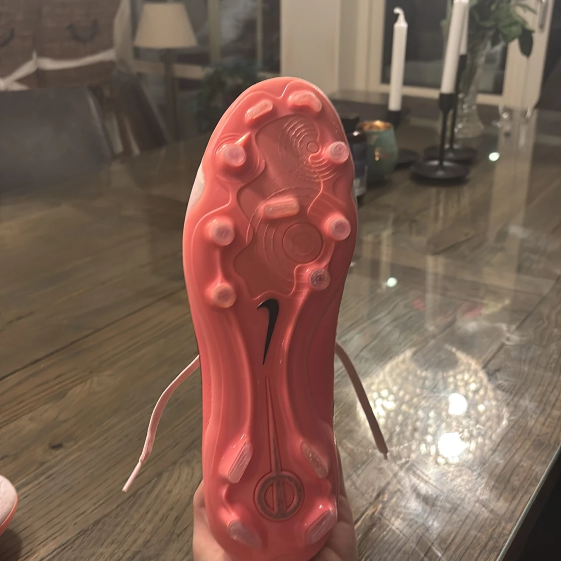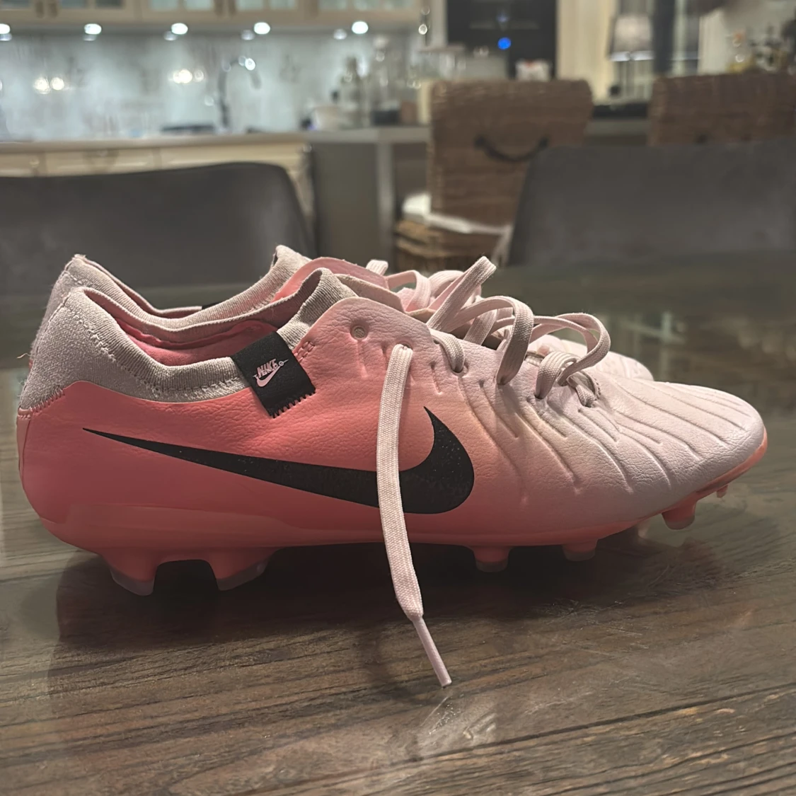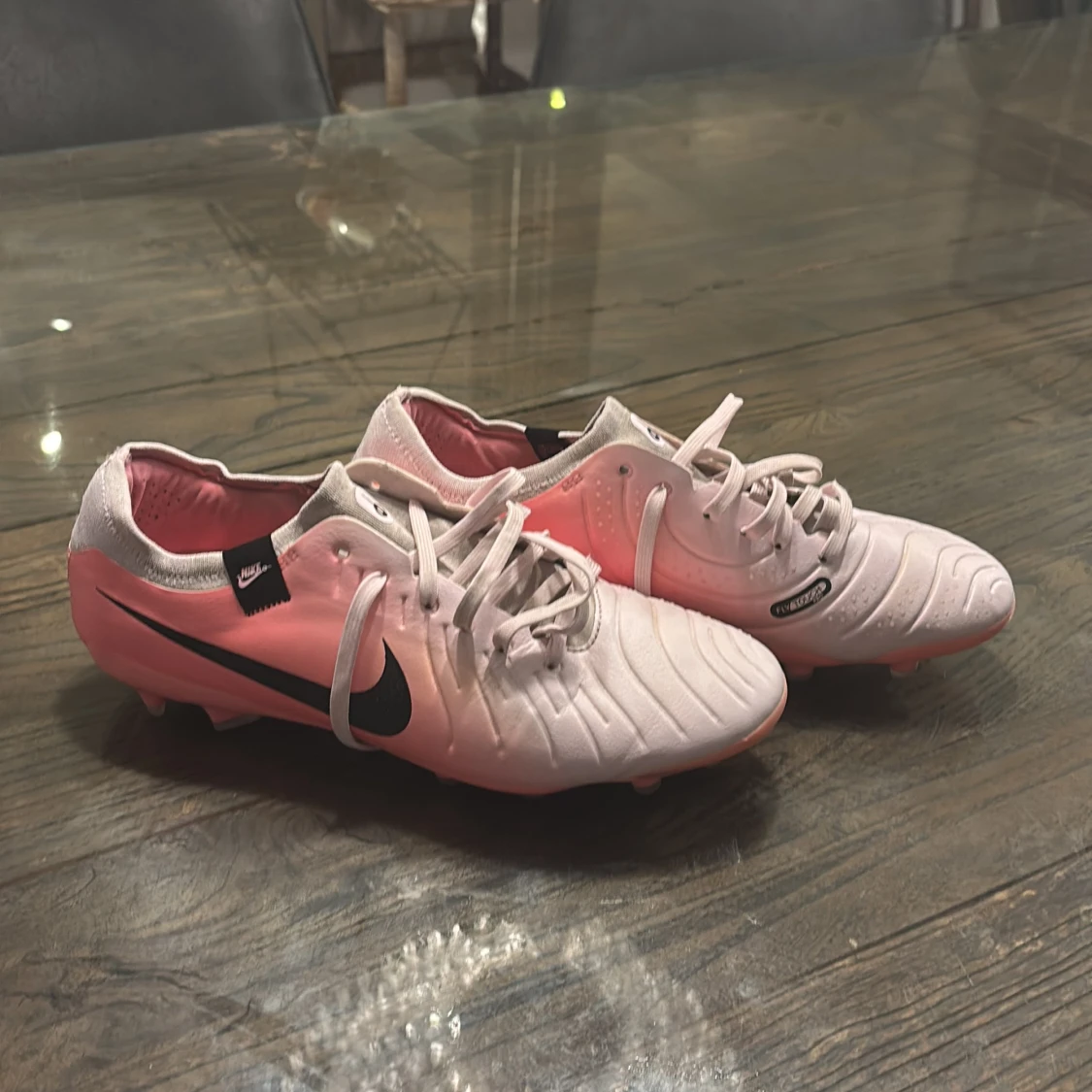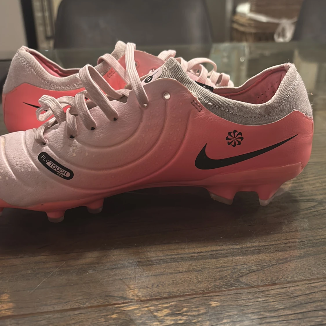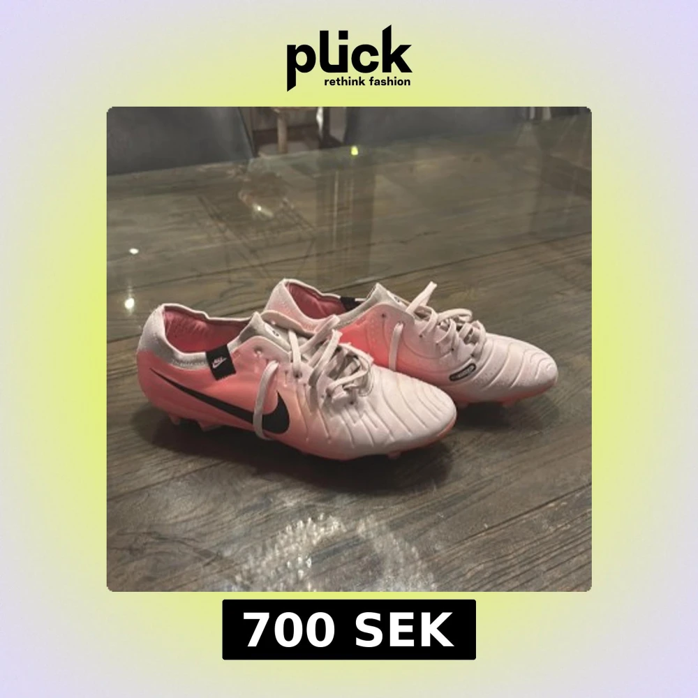 Snygga Nike Tiempo i en gradient av rosa och vit med svart Nike-logga. Skorna är inte använda så mycket och skorna har snörning och är designade för optimal bollkontroll. Perfekta för fotbollsplanen!