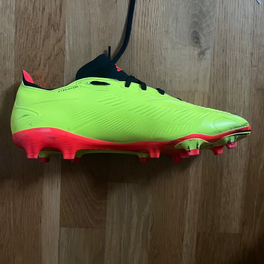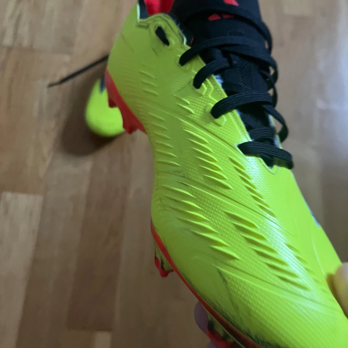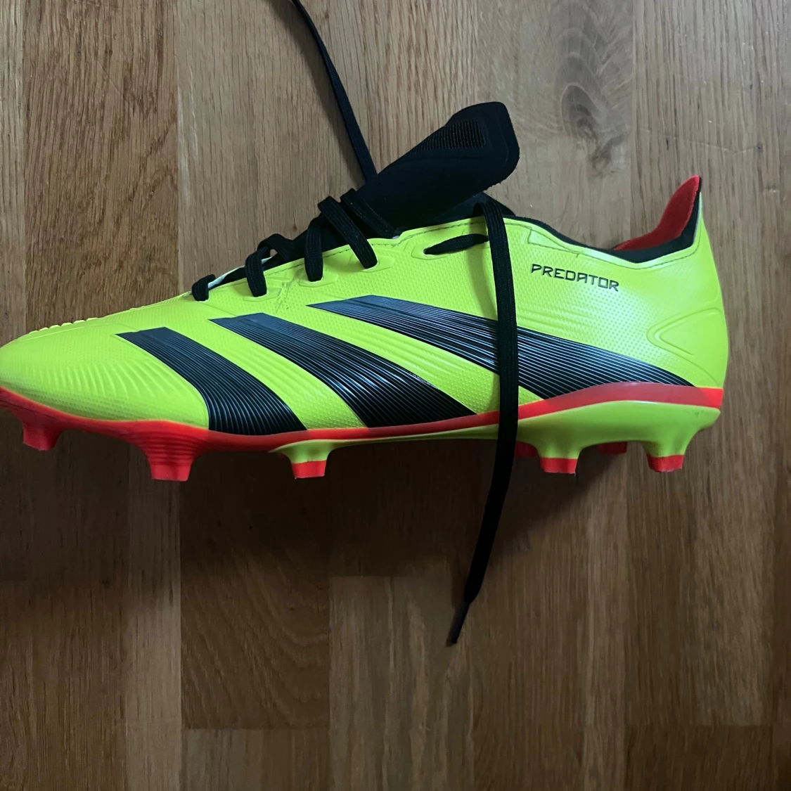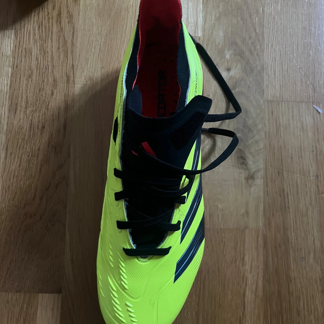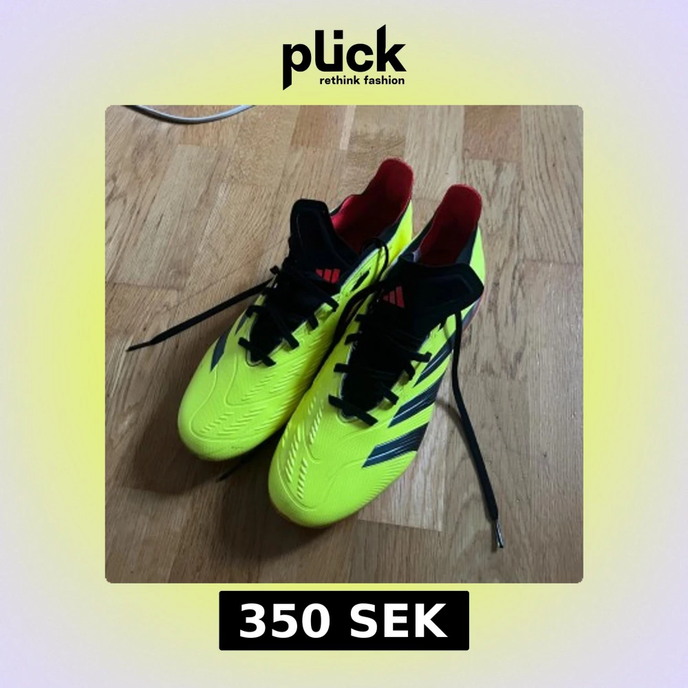 Säljer ett par Adidas Predator fotbollsskor i neon-gult med svarta och röda detaljer. Skorna har klassisk snörning, låg profil och mönstrad ovandel i syntetmaterial för extra grepp. Perfekta för dig som vill sticka ut på planen.