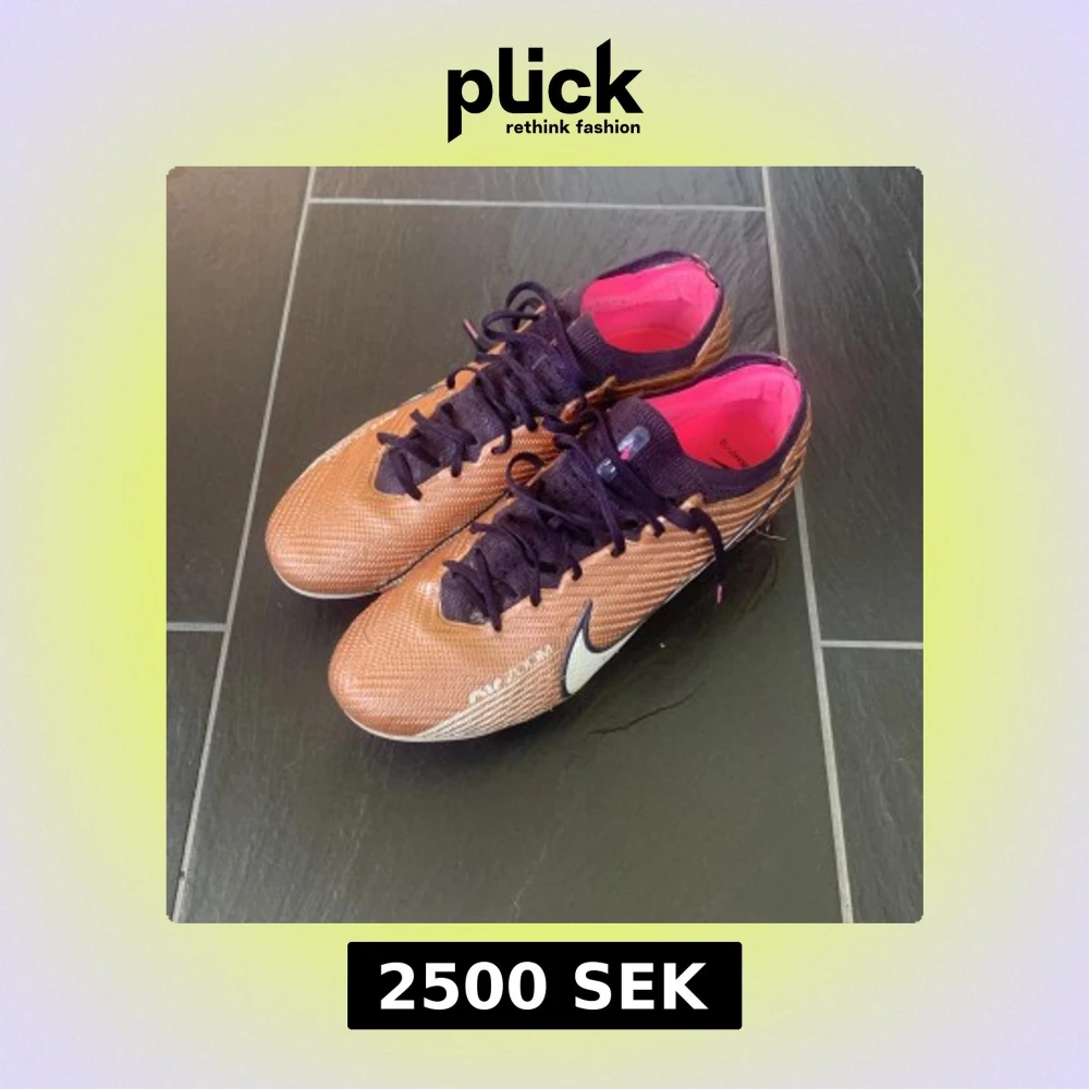 Snygga Nike Mercurial Zoom fotbollsskor i brons med svarta snören och detaljer, samt rosa innersula och dobbar. Don är använda en gång av mig, sen lite mer används av en annan ägare. Men inga problem med skorna förutom att det glansiga har försvunnit lite på sulan vilket brukar hända efter få antal träningar. Annars är skorna helt felfria och kan hålla under en längre tid. Så nästan nyskick! Storlek 42