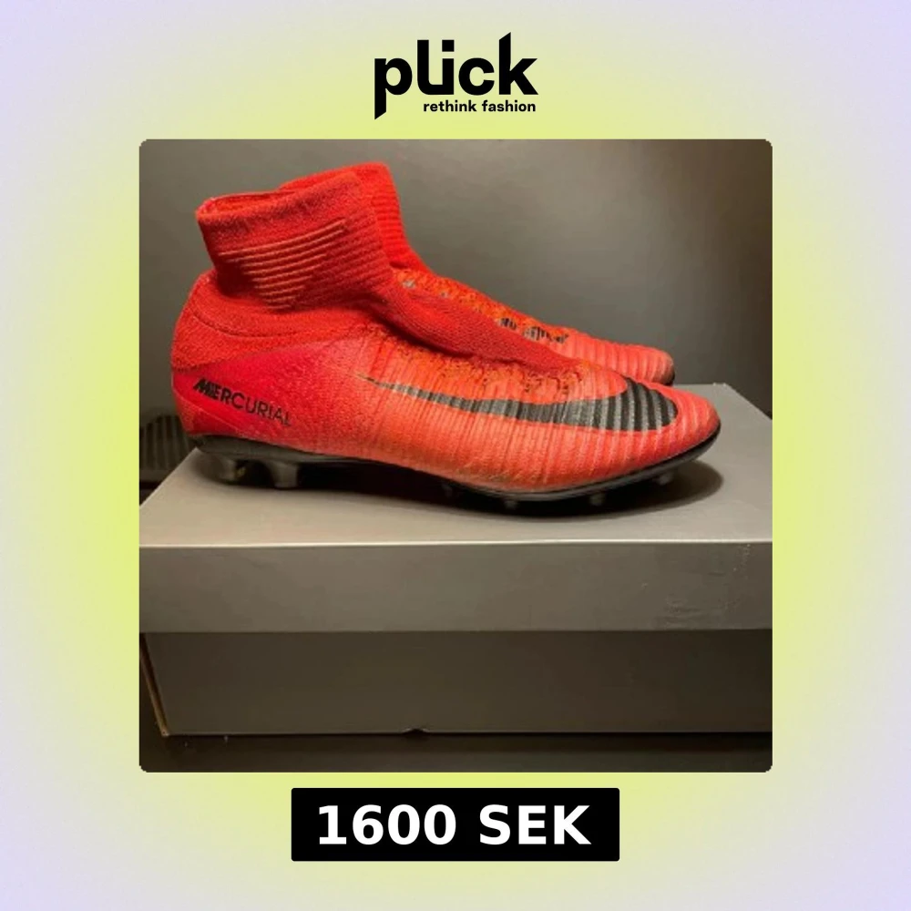 Säljer ett par röda Nike Mercurial fotbollsskor med svart swoosh och hög strumpkrage. Skorna har en tight passform och är designade för spel på gräs. Perfekta för dig som vill ha snabba och lätta skor på planen.