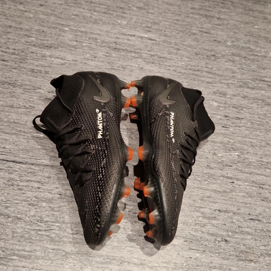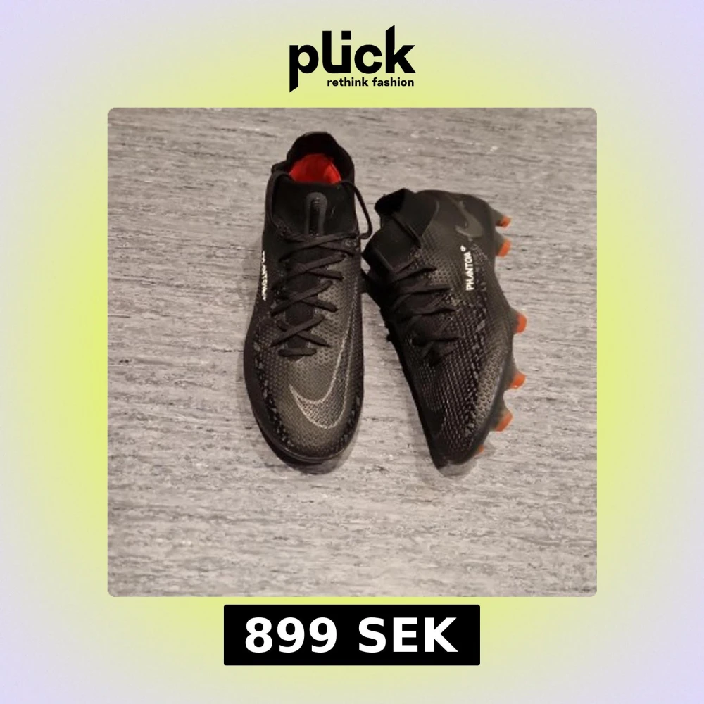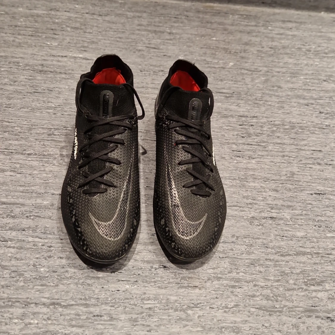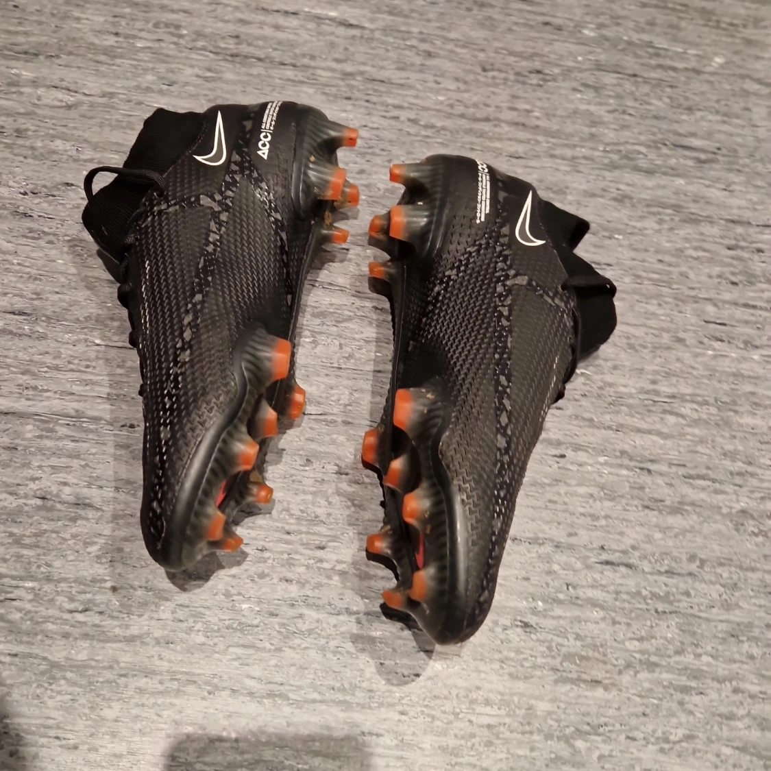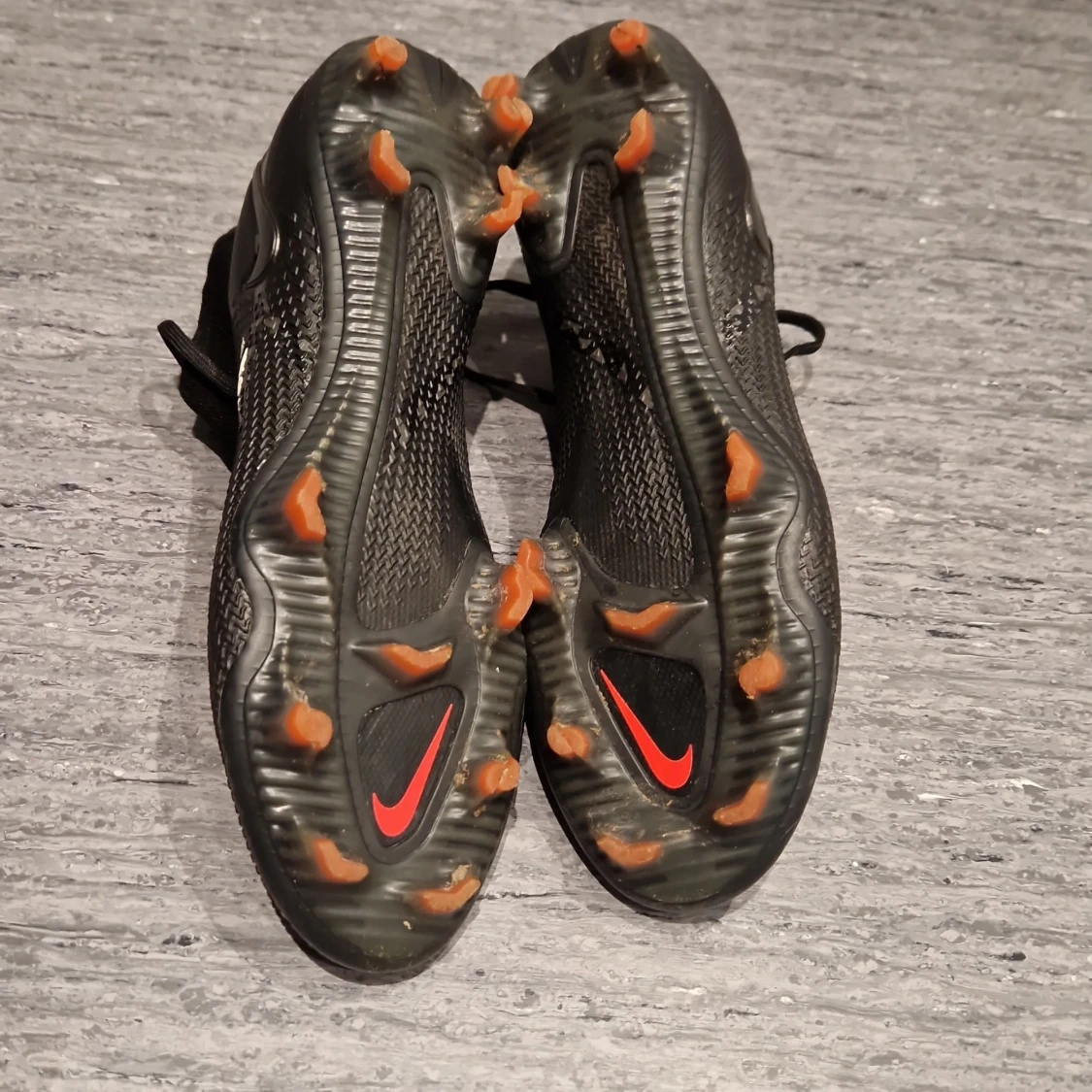 Säljer ett par Nike Phantom GT fotbollsskor i svart med orange detaljer på dobbarna och röd insida. Skorna har snörning, syntetmaterial och en modern design med vit Nike-logga på sidan. Perfekta för dig som vill dominera på planen.