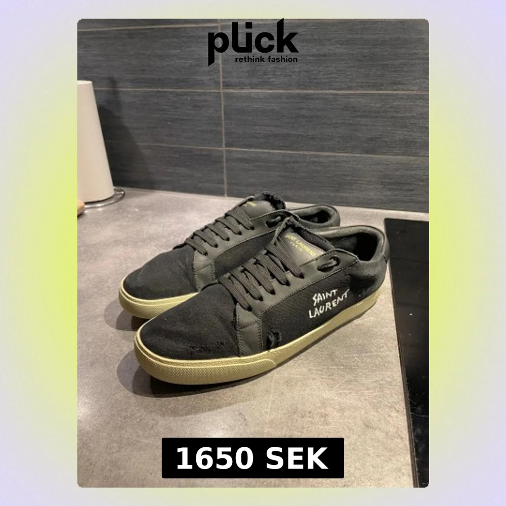 Svarta sneakers från Saint Laurent med broderad logga på sidan och guldfärgad text på plösen. Skorna har snörning, rund tå och en beige platt sula. Ovandelen är i canvas med detaljer i skinn, vilket ger en sjysst kontrast. PRIS EJ HUGGET I STEN VID SNABB AFFÄR