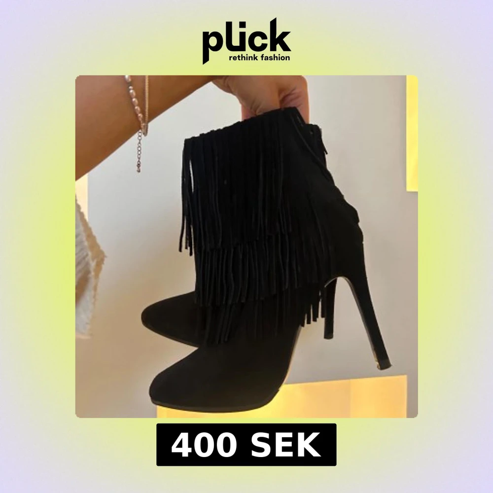 Snygga svarta boots med hög klack och fransdetaljer. Perfekta för att ge en trendig touch till din outfit. Tillverkade i mocka för en lyxig känsla. Väldigt bra skick men vid dragkedjan på ena skon är de lite trådar som hänger men de är bara att klippa av.
