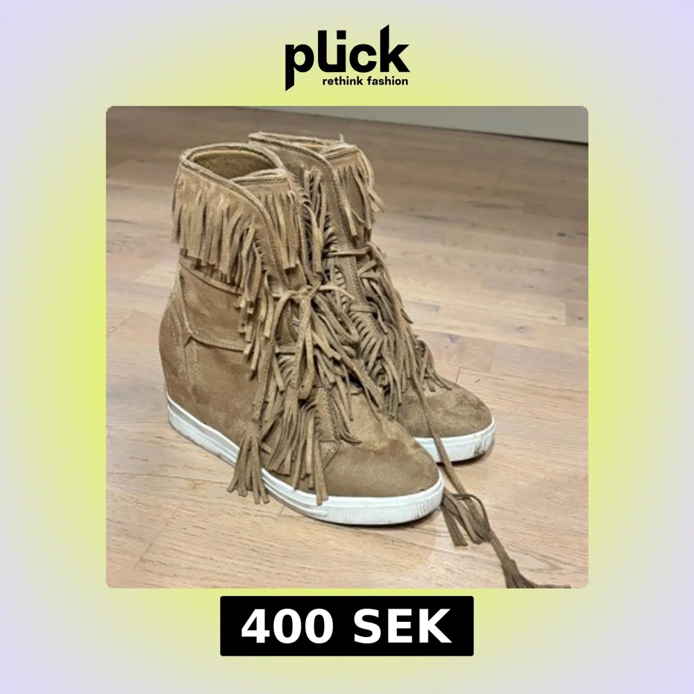 Säljer ett par bruna boots med klack i mocka med coola fransdetaljer runt hela skon. Skorna har snörning framtill och vit platt sula. Perfekt för dig som vill sticka ut med en unik och trendig stil. Använda några få gånger däremot köpta på vinted men stog att de skulle va nya och såg helt nya ut, nypris ca 1300. Älskar dem men tyvärr fel storlek