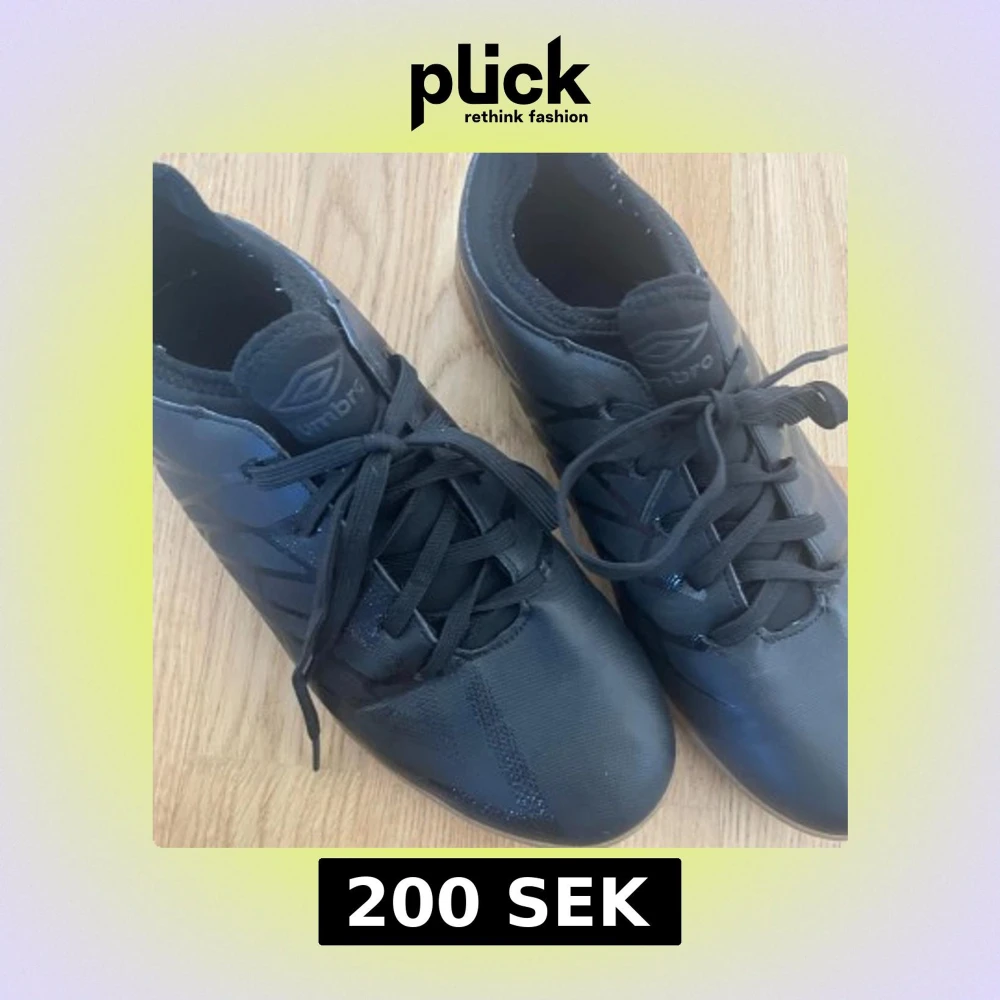 Säljer ett par svarta fotbollsskor från Umbro med snörning och en stilren design. Skorna har en gummisula som ger bra grepp på planen. Perfekta för inomhusspel.