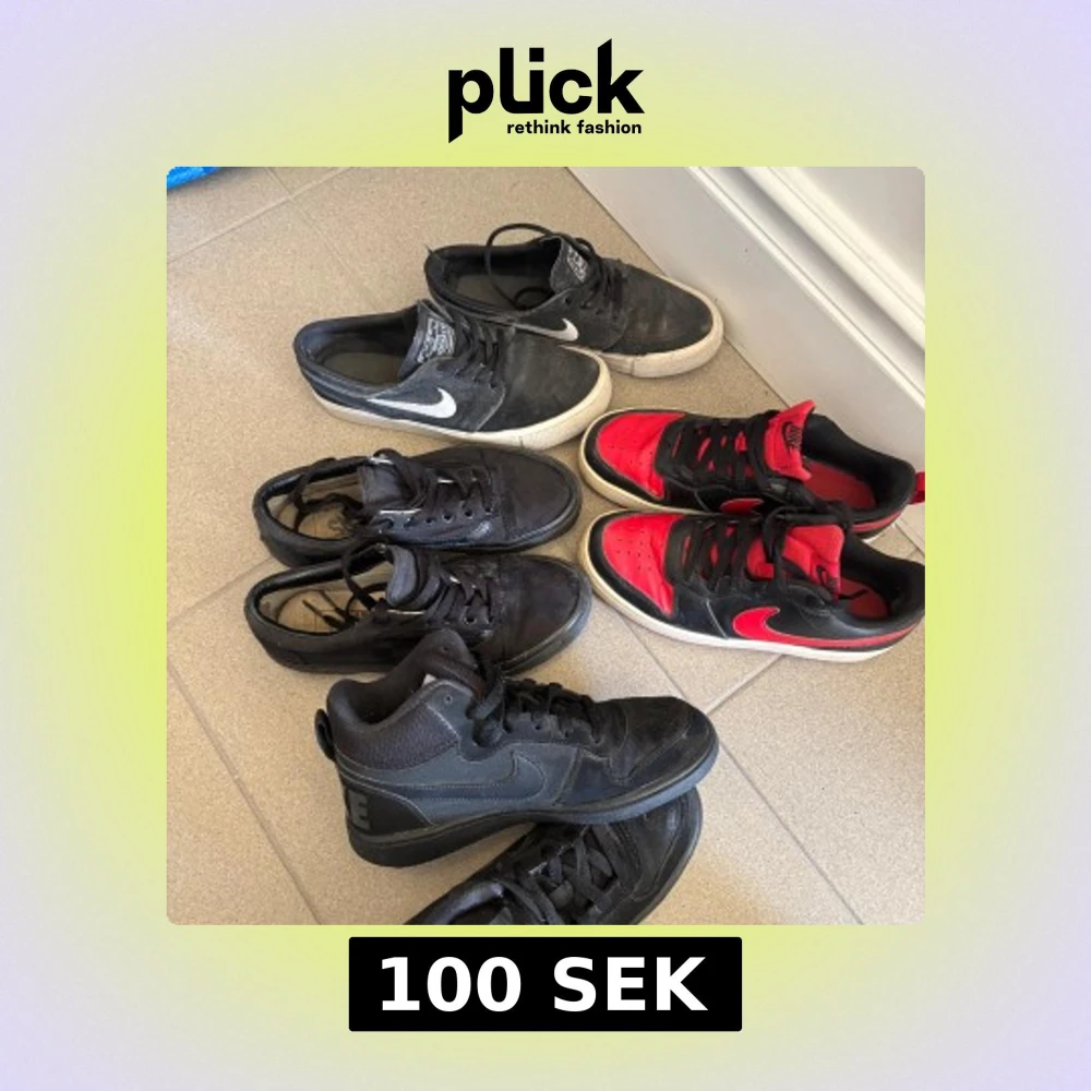 Fyra par sneakers: ett par svarta Nike high-tops, ett par svarta Vans med vit sula och vit swoosh, ett par svarta låga sneakers och ett par Nike sneakers i svart och rött med vit sula.