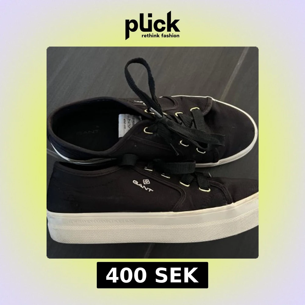 Säljer ett par svarta sneakers från Gant med vit sula och svarta skosnören. Skorna har låg profil och Gant-logga på sidan. Perfekta för en stilren vardagslook.