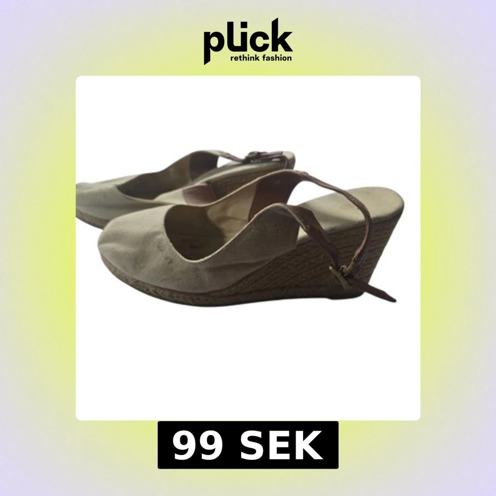 Snygga beige kilklackar från Gant med ovandel i canvas och bruna läderdetaljer. Skorna har öppen häl med justerbart spänne och flätad sula i espadrillestil. Perfekta för en somrig look med avslappnad känsla.